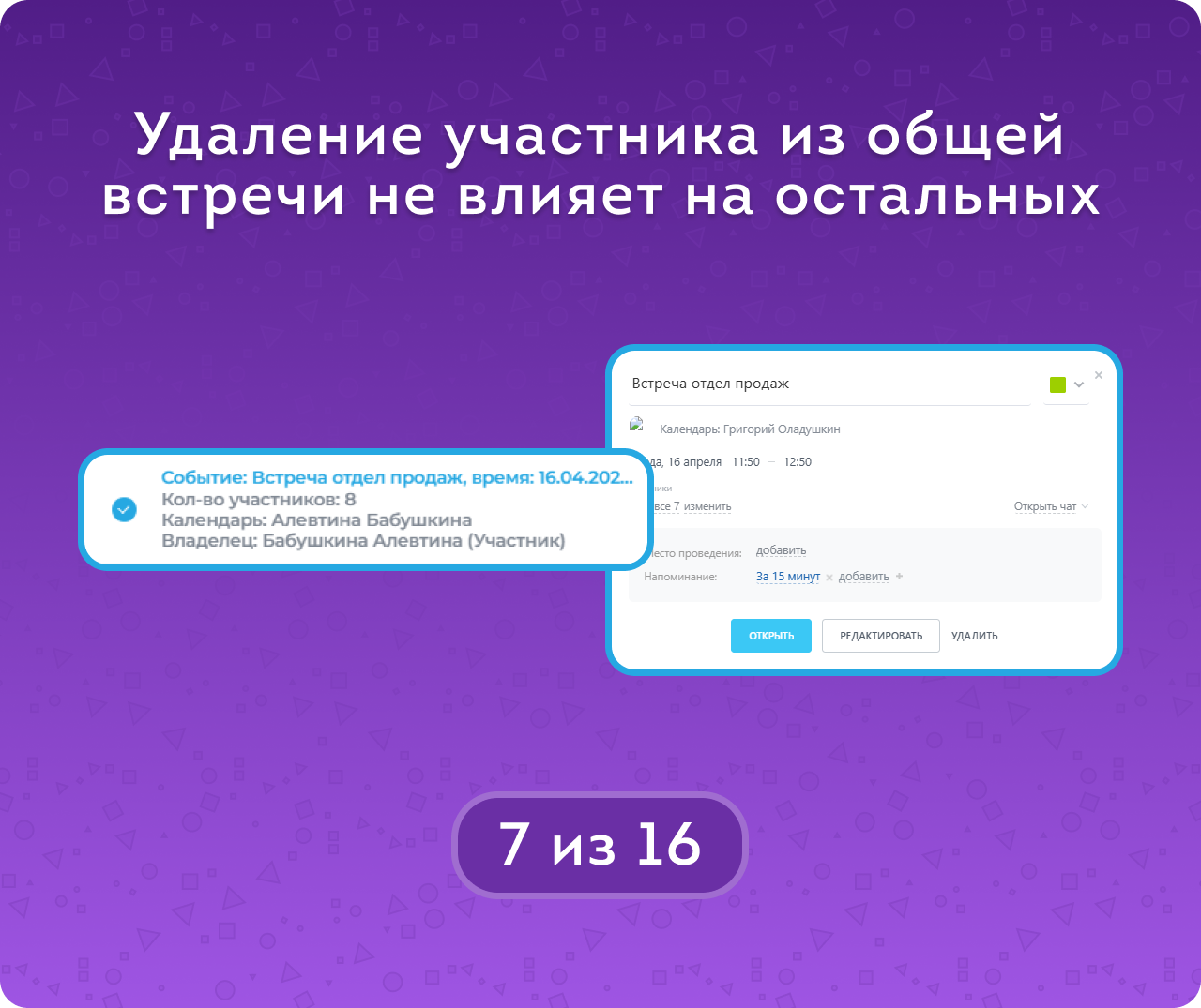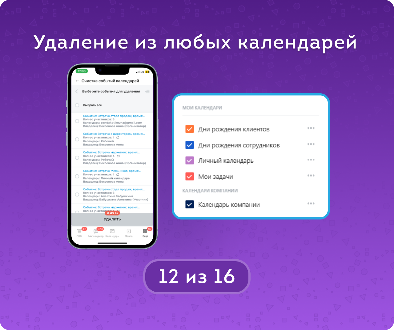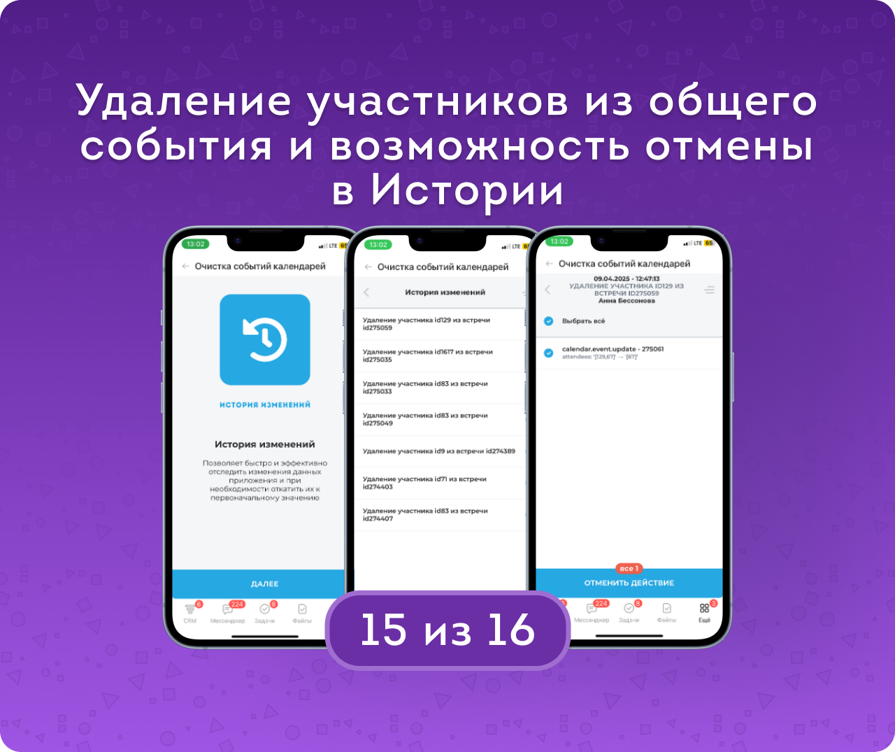 Важно! События удаляются из календарей полностью, без возможности восстановления. В разделе «История» останется только запись об исключении участника из общего события. Сам факт удаления события не фиксируется из-за ограничений REST API.