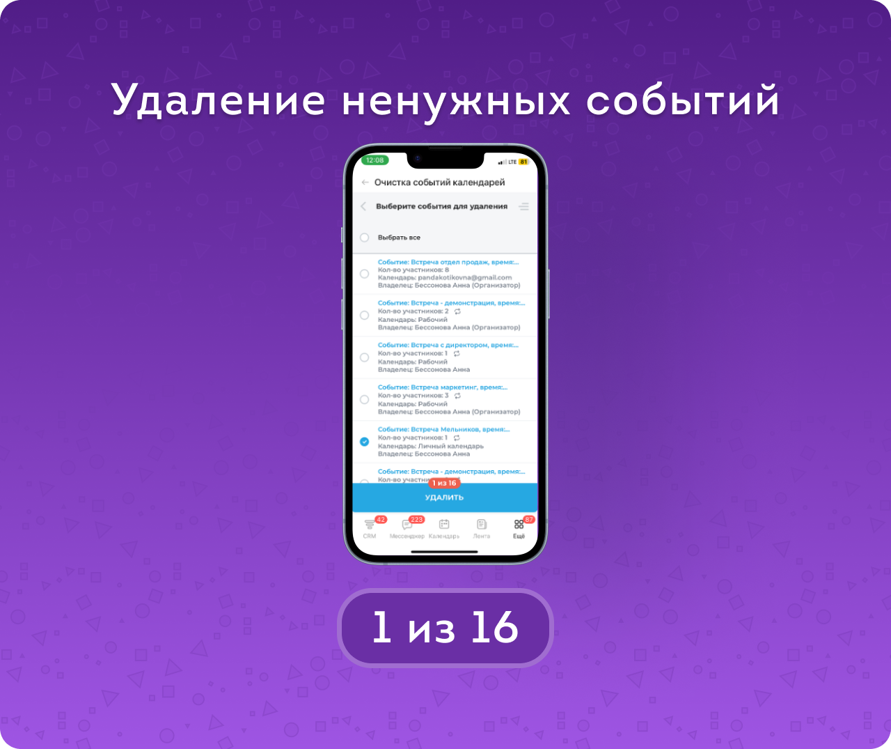 Со временем это может превратиться в информационный шум: события наслаиваются и устаревают. После повторных синхронизаций появляются дубли, о которых могут приходить множественные напоминания. В результате — сотруднику сложно ориентироваться в графике, а руководителю трудно оценивать реальную загруженность команды. При этом в типовом функционале Битрикс24 нет инструмента для массовой чистки событий. Удаление вручную — долго, неудобно и не подходит для регулярного использования. Для этого нужно открыть профиль каждого сотрудника, потом — его Календарь, найти ненужную встречу и удалить.