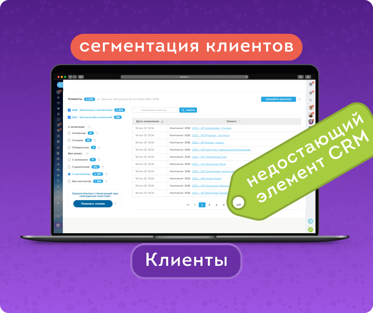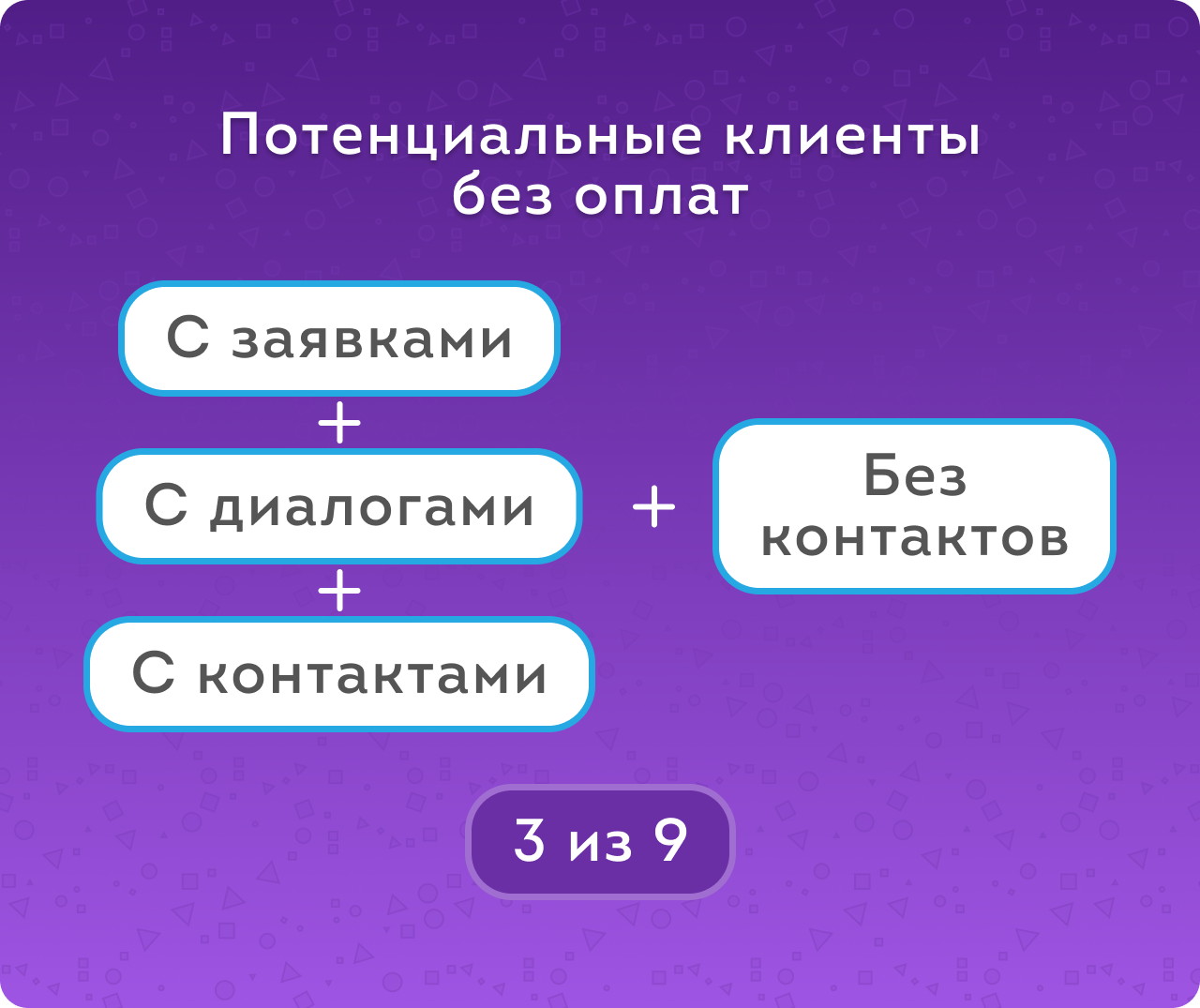 — Сегментация Клиентов без оплат: с заявками, с диалогами, с контактами или без них.