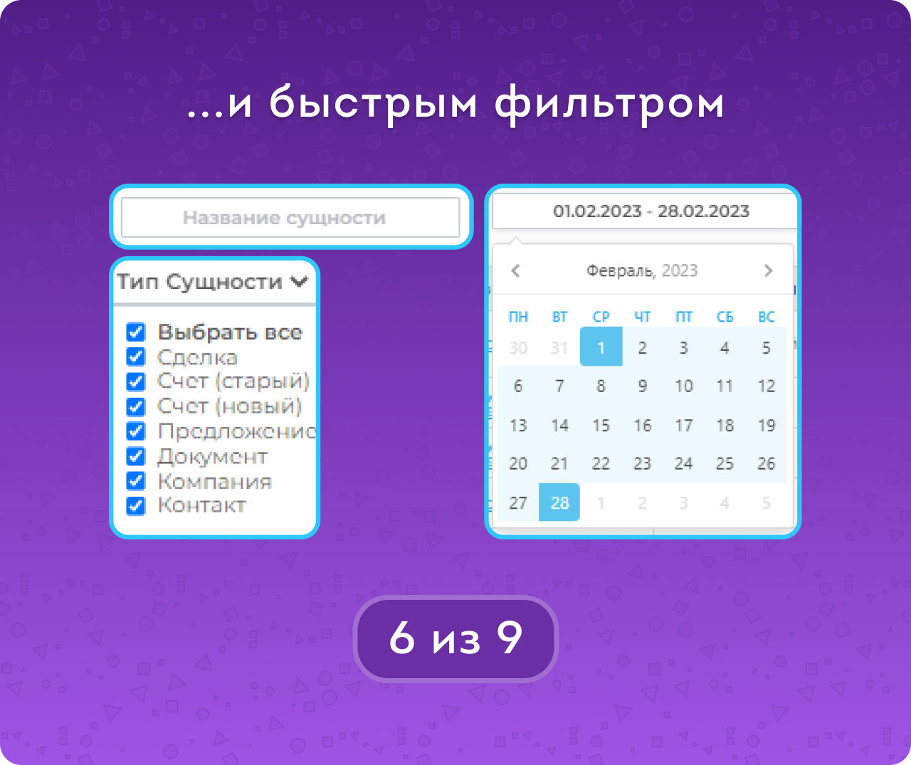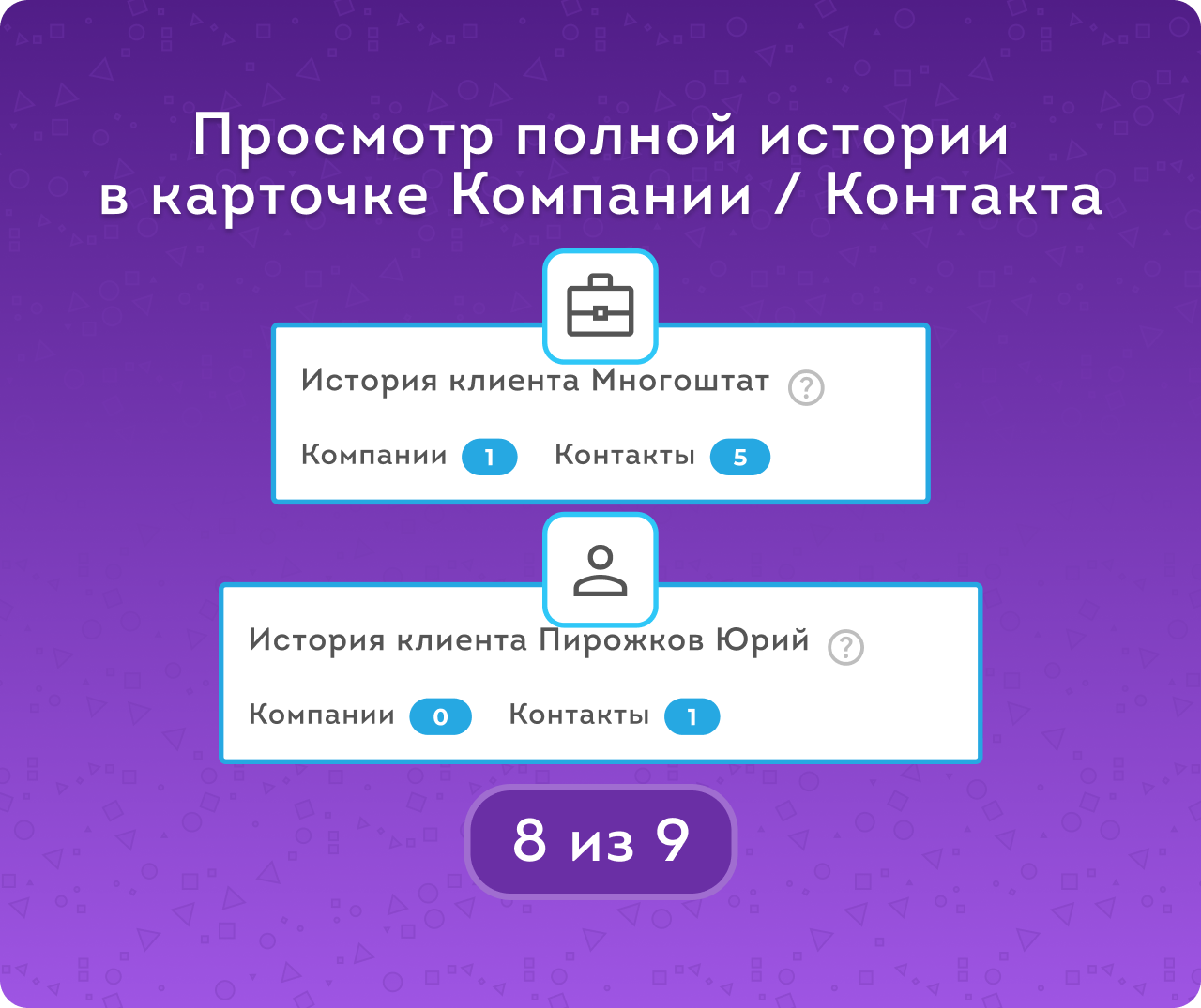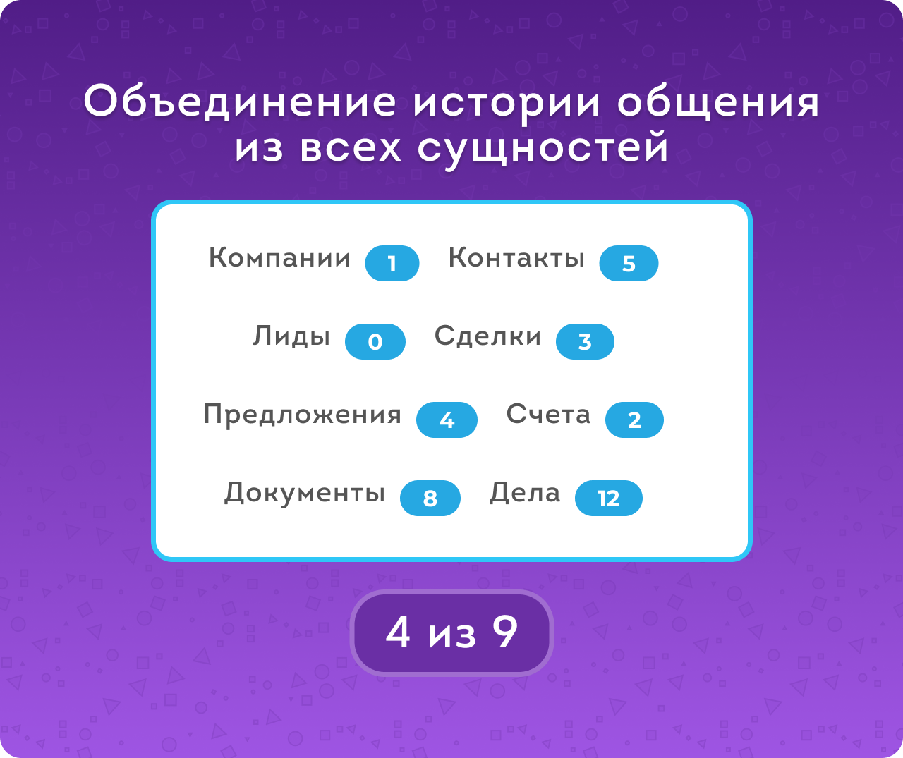 — Встройка в карточках Контактов и Компаний с полной историей взаимодействий.