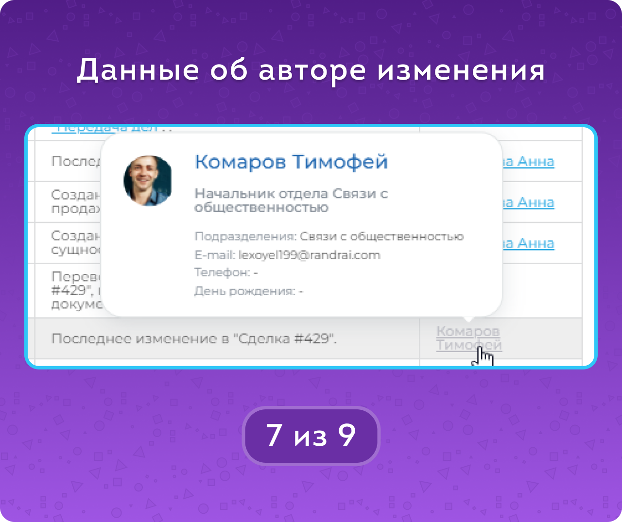 Поля Автор события и Ответственный (это может быть как один сотрудник, так и разные), с полной информацией о сотруднике при наведении: ФИО, отдел, должность, фото, телефон.