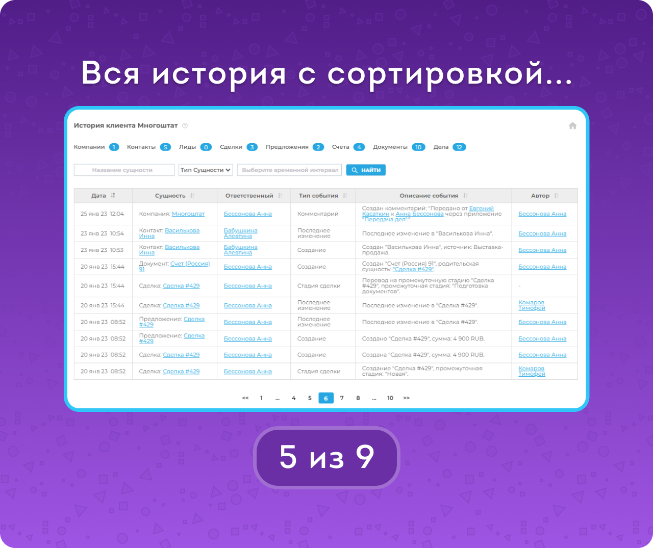 Представим стандартную схему: создается Лид на основании входящего звонка, менеджер договаривается о продаже, Лид конвертируется в Контакт и Сделку. Дальше очень много вариаций возможных событий - создание и движение Сделок по стадиям, звонки, выставление Счетов, создание документов, и так далее. В карточке или истории Контакта вы видите неполную информацию. А если вы откроете встройку Клиенты в карточке нужного контакта – вы увидите все эти события полностью, с возможностью фильтрации по сущностям и датам, а также с сортировкой по Ответственному и Автору (это могут быть разные сотрудники).