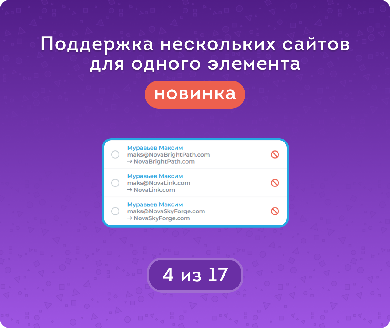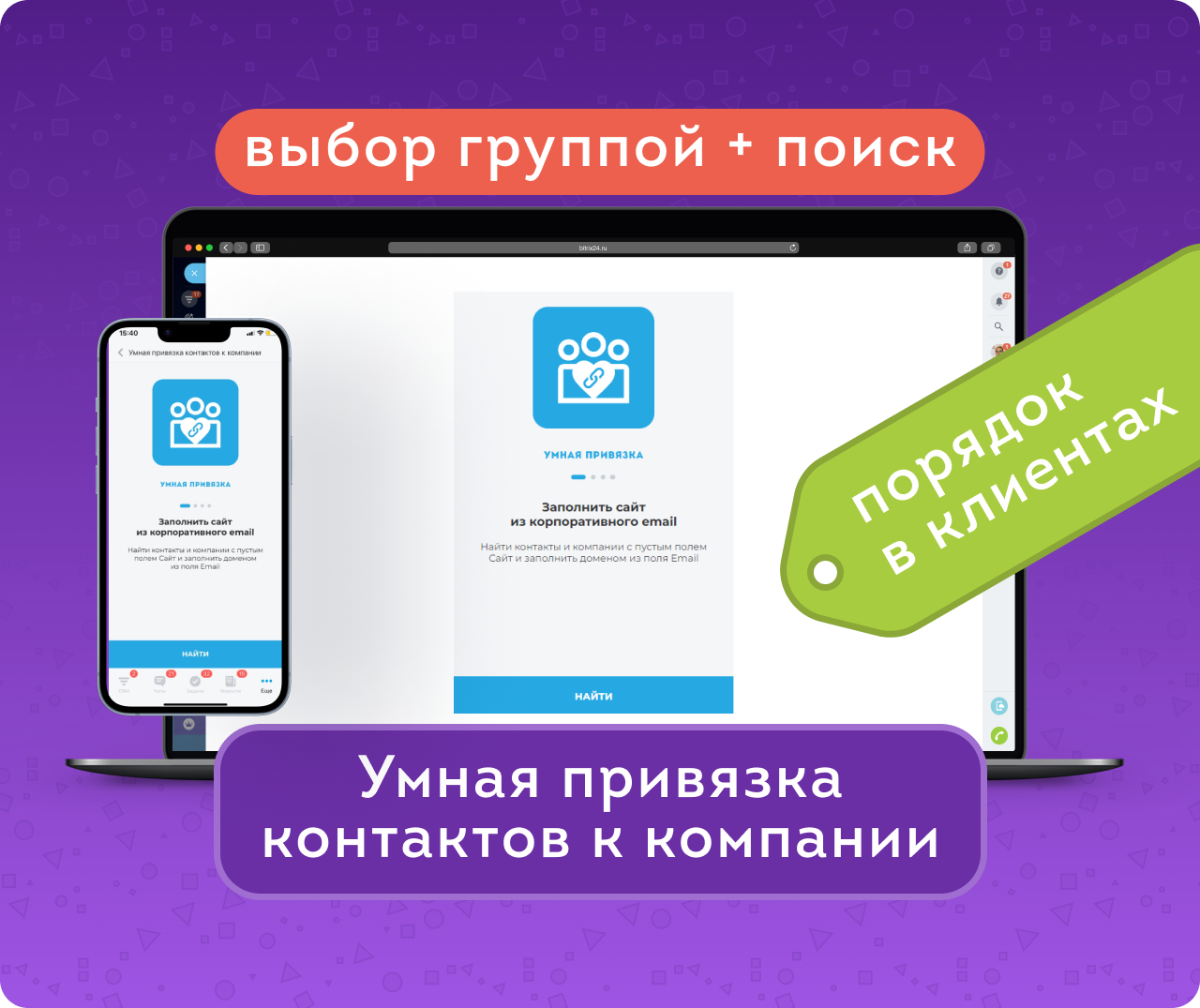 Групповой выбор одинаковых элементов (NEW) позволит, например, выбрать все Контакты и Компании с одинаковым телефоном и связать их между собой.