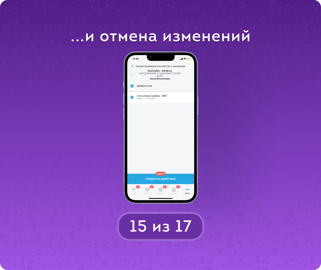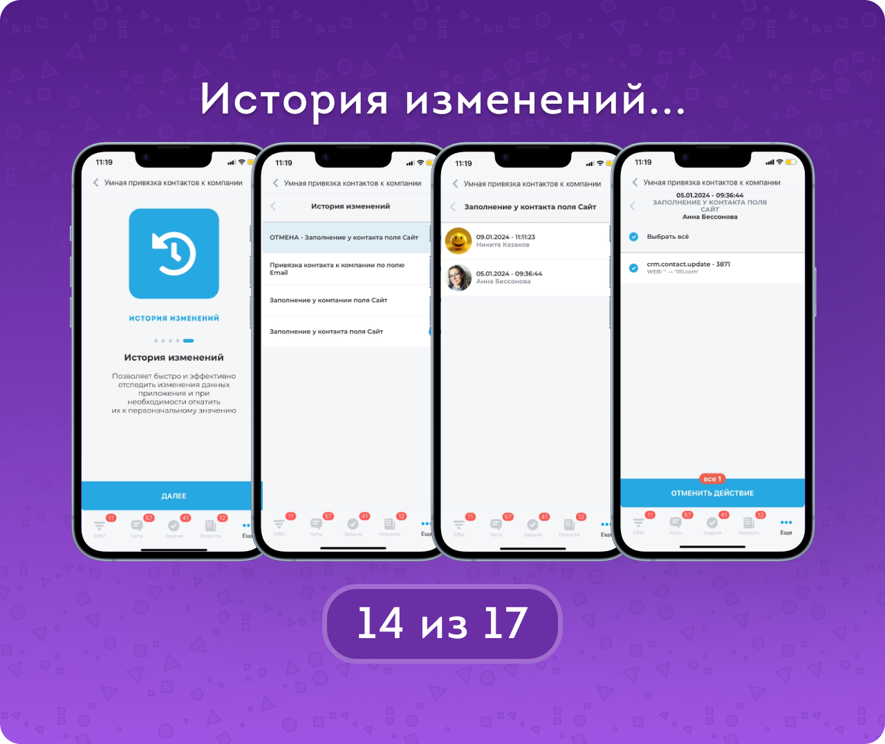 История изменений позволяет быстро и эффективно отследить изменение данных через приложение и при необходимости откатить их к первоначальному значению. В зависимости от прав доступа можно просмотреть, кто и когда заполнял поле Сайт, или привязывал контакты к компании, а также отменить действие.