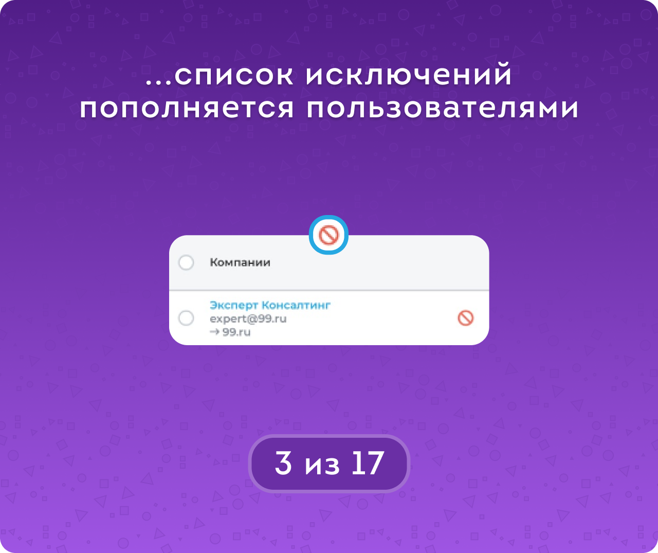 Список исключений — это отдельный режим, в котором находятся как «общие» почтовые домены, которые считаются исключениями, (например, gmail.com), так и частные, те, которые добавили на вашем портале. В любой момент вы сможете скорректировать этот список — убрать те, которые не хотите считать исключениями, или добавить своих в режиме Заполнить сайт из email.