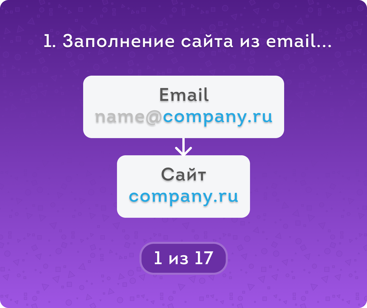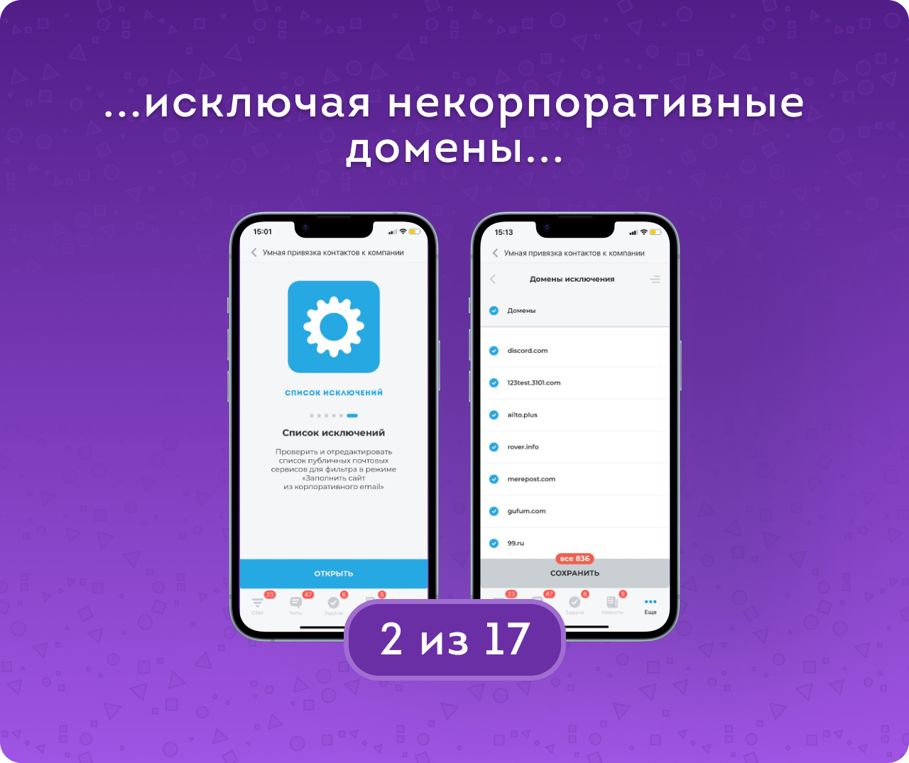 Этот режим обрабатывает ситуацию, когда у контактов и компаний заполнен email, но поле Сайт пустое. Приложение исключает более тысячи распространенных почтовых адресов (mail.ru, yandex.ru, inbox.ru и так далее) и предлагает только те варианты заполнения, которые подходят. Например, если у компании в поле email ask@sozdavatel.ru, то после заполнения в поле Сайт будет sozdavatel.ru. И точно так же заполняется поле Сайт у контактов. А неподходящие вам почтовые домены вы можете добавить в Список исключений, и они больше не будут появляться в выборке данных. После того, как у всех поле Сайт заполнено — можно приступать к следующему режиму.Связать контакты с компанией по полю Сайт