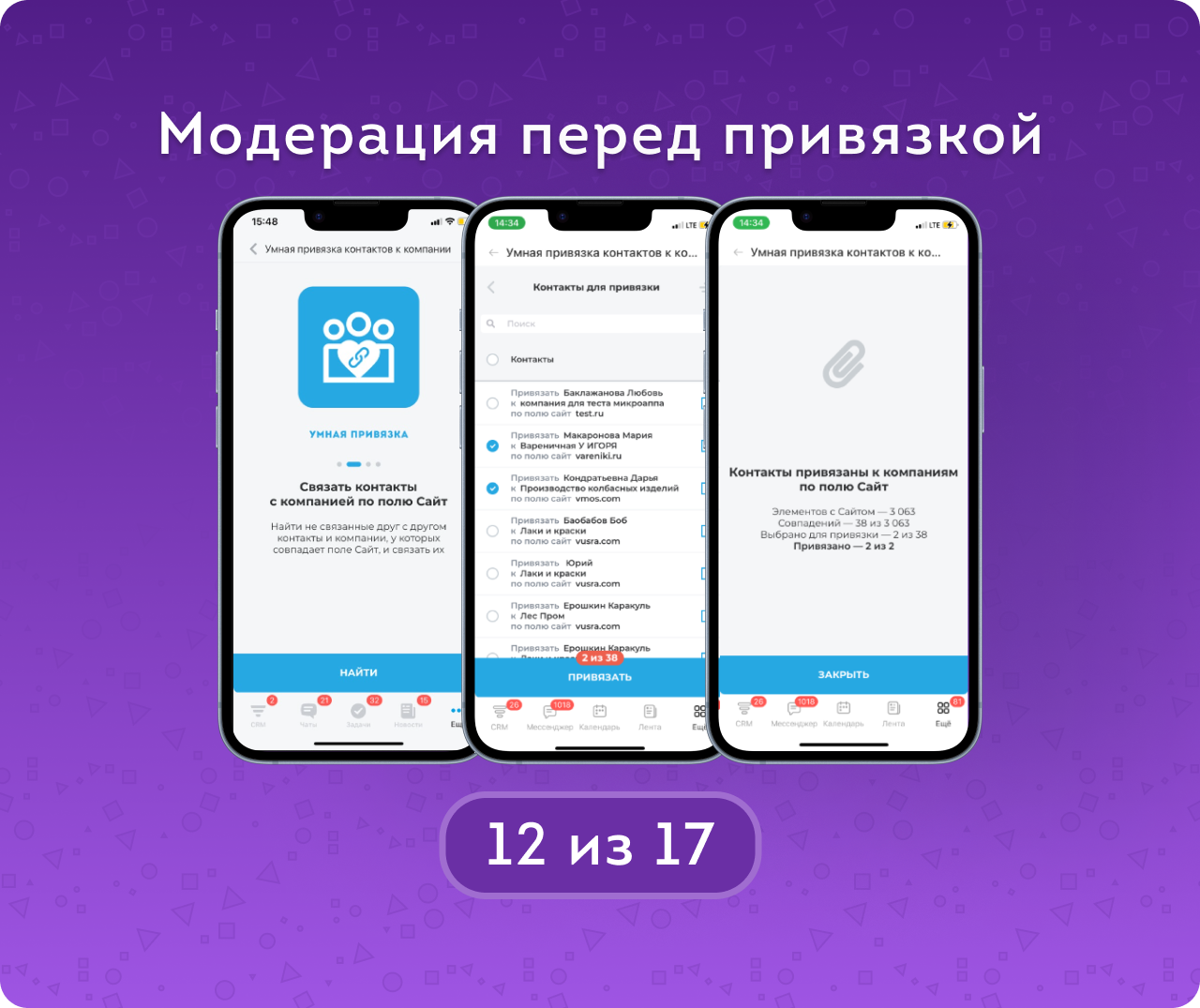В этом режиме открывается список тех контактов, по которым найдены совпадения с компаниями по полю Сайт. Для корректной обработки совпадений данные приводятся к единому стандарту, например, если в трёх Контактах поле Сайт заполнено тремя разными вариантами: www.sozdavatel.ru, https://sozdavatel.ru/ и SOZDAVATEL.RU — приложение воспримет их одинаково и предложит привязать к Компании с полем Сайт sozdavatel.ru. При нажатии кнопки «Привязать» происходит автоматическая связка таких контактов с нужными компаниями.