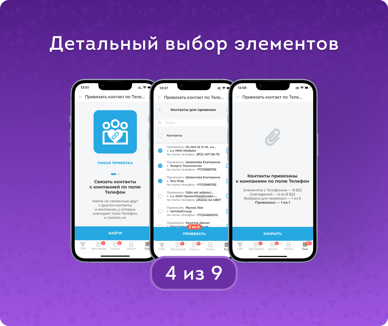 Групповой выбор одинаковых элементов (NEW) позволит одним кликом выбирать все Контакты и Компании с одинаковым номером телефона и связать их между собой.