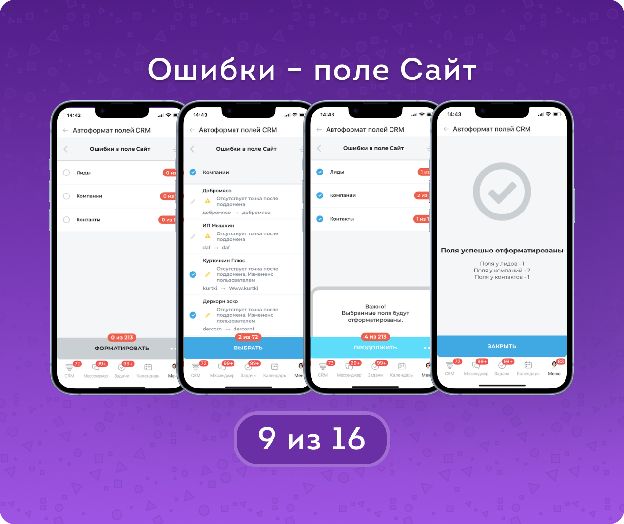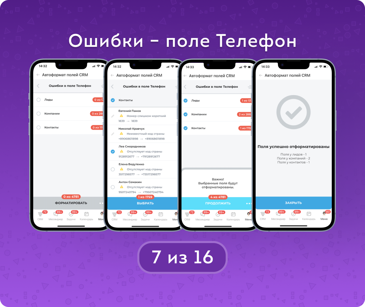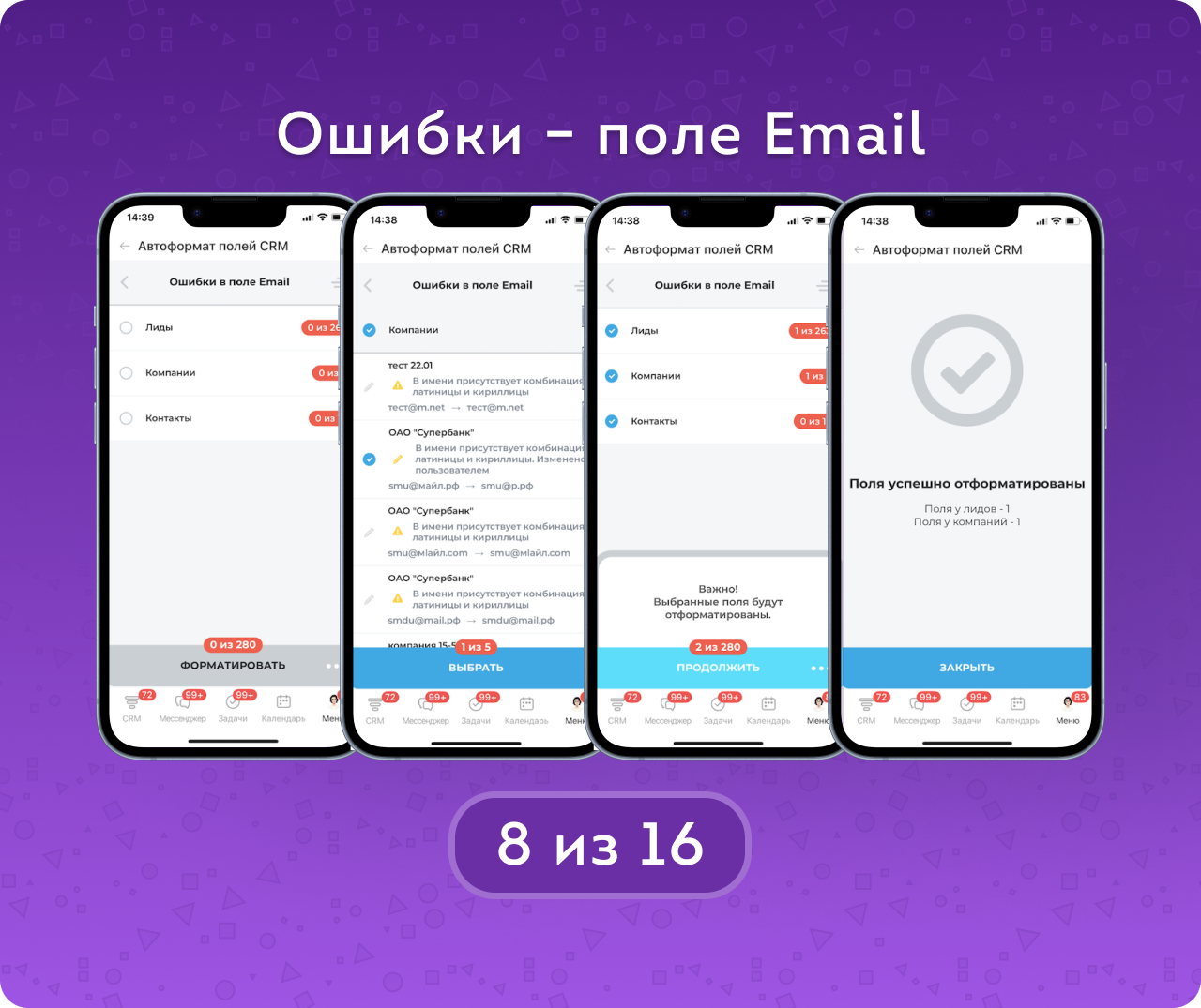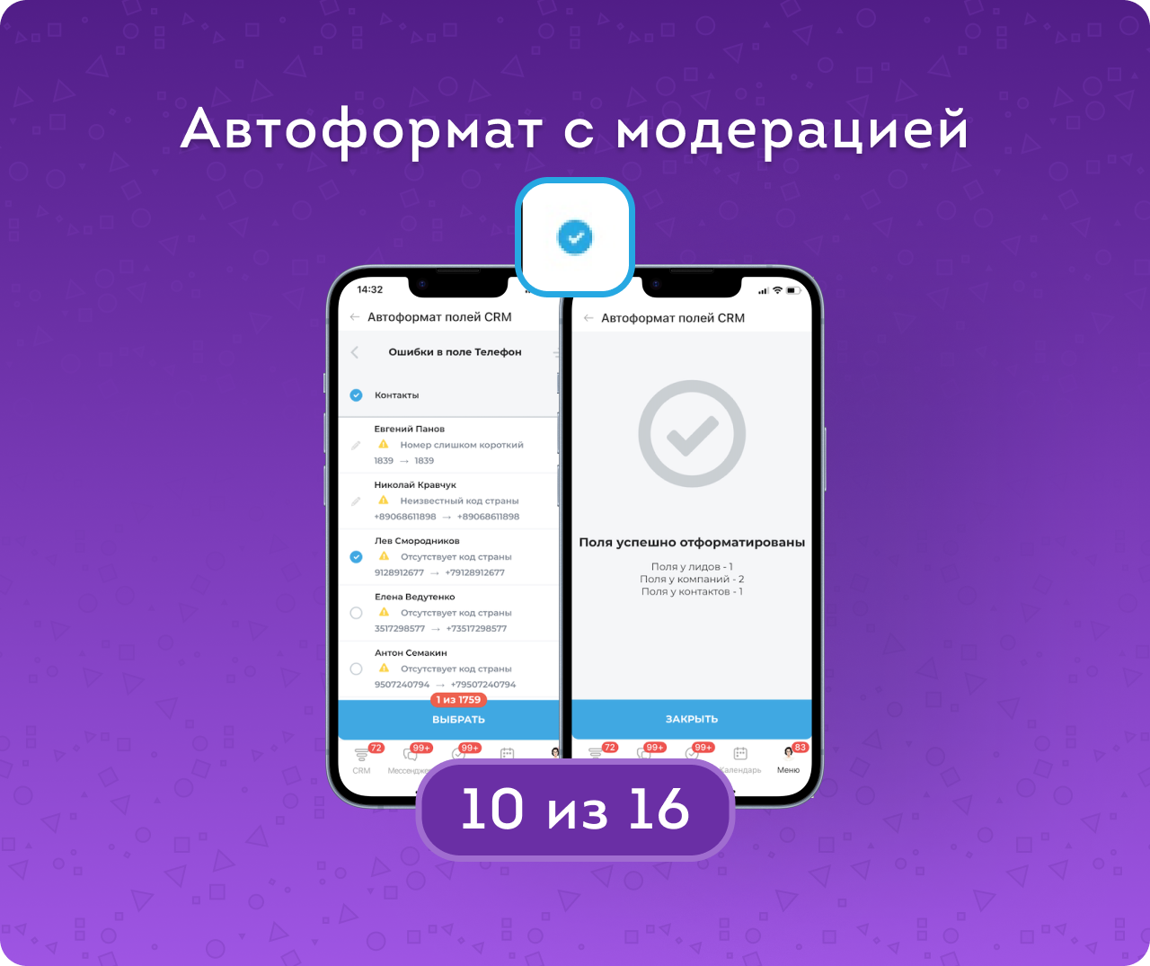 Автоформат полей CRM — приложение для автоматического поиска, проверки и исправления ошибок в контактных данных клиентов. Приводит в порядок телефоны, email и сайты в лидах, контактах и компаниях, помогая очистить базу от некорректных и «битых» данных.