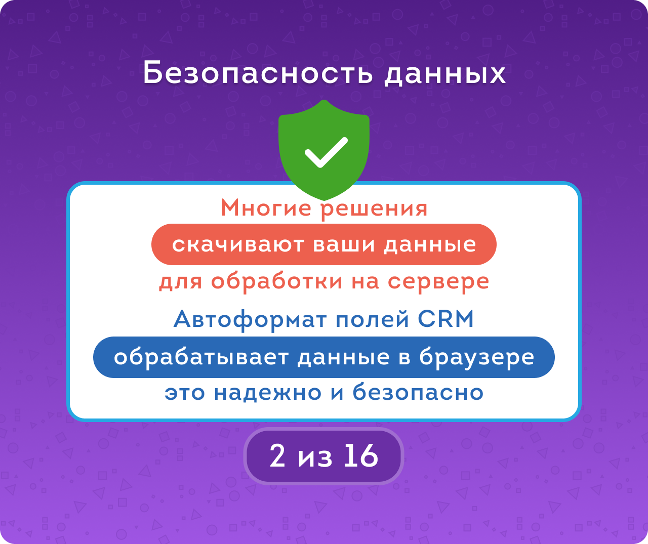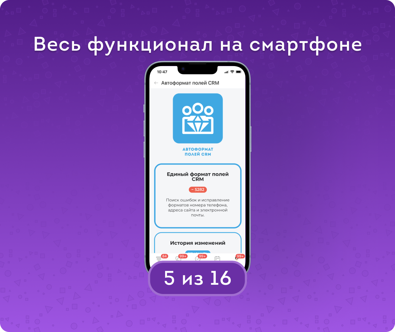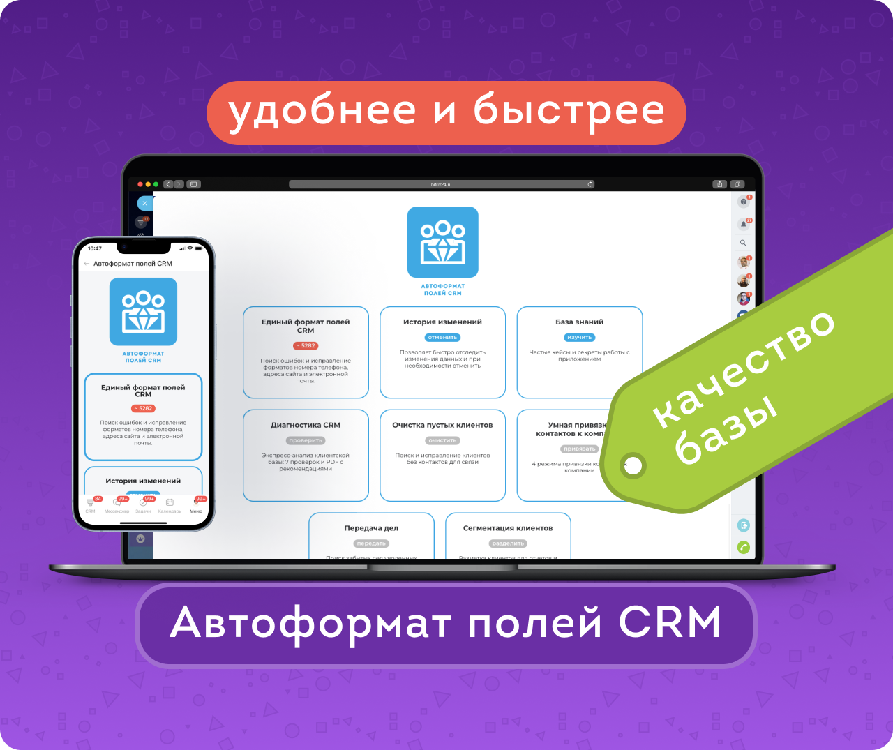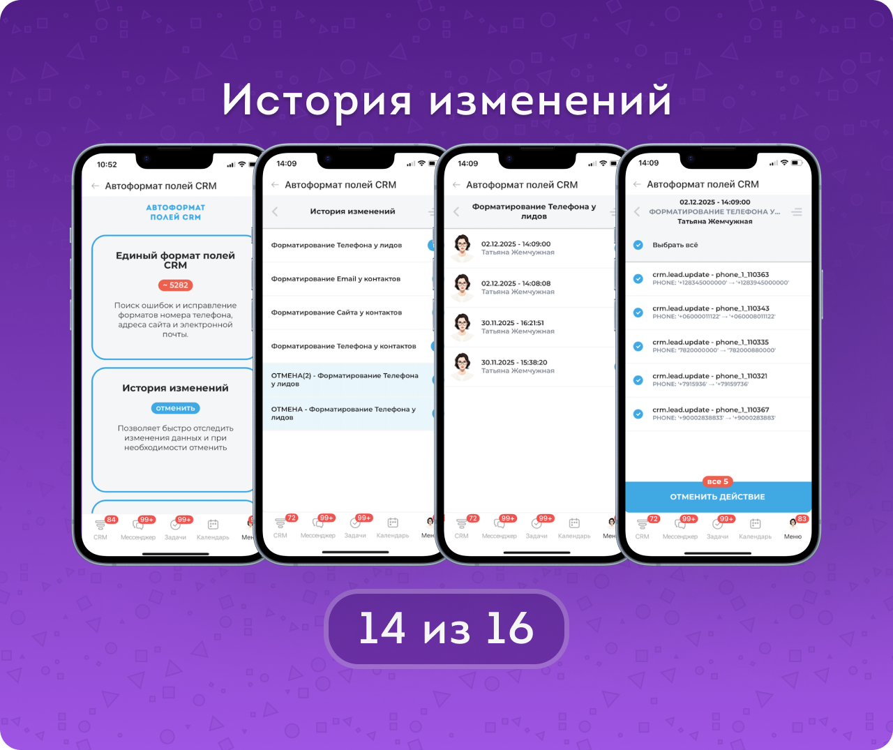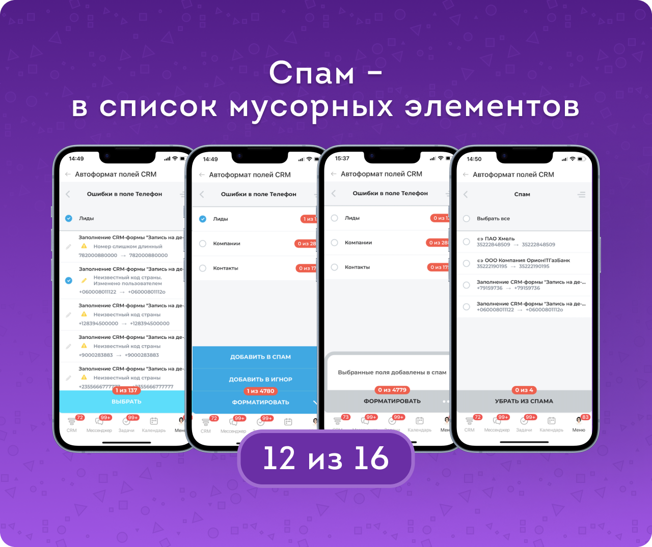Автоформат полей CRM — приложение для автоматического поиска, проверки и исправления ошибок в контактных данных клиентов. Приводит в порядок телефоны, email и сайты в лидах, контактах и компаниях, помогая очистить базу от некорректных и «битых» данных.