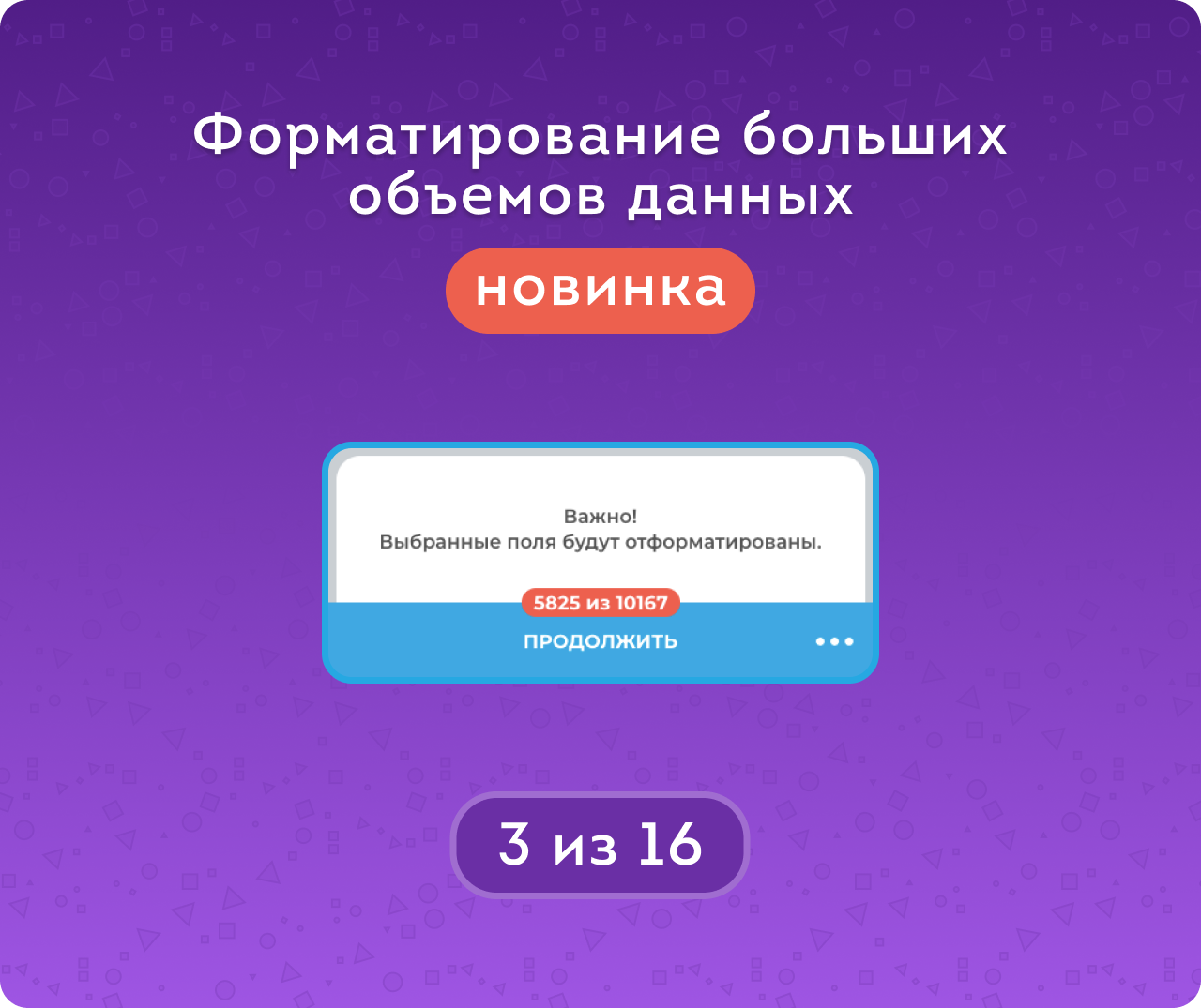 Можно выбирать сущности как точечно, так и все сразу. Однако при большом объёме данных (например, при обработке тысяч записей) может сработать лимит на количество запросов. В этом случае процесс автоматически приостановится на 10 минут, после чего его можно будет возобновить нажатием кнопки «Продолжить» (NEW).