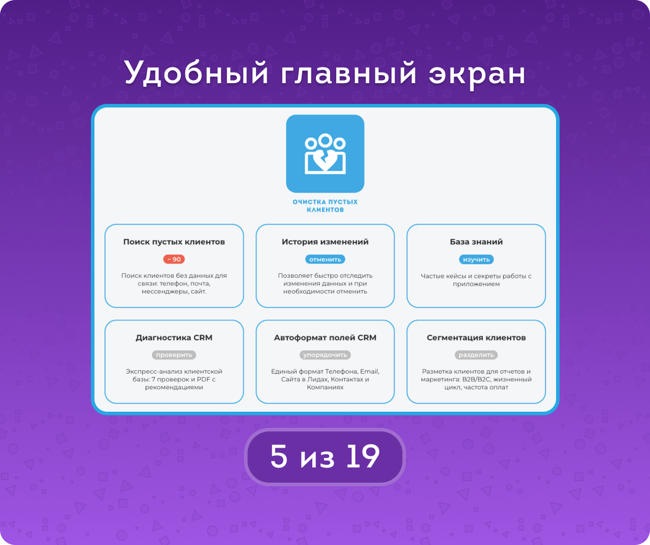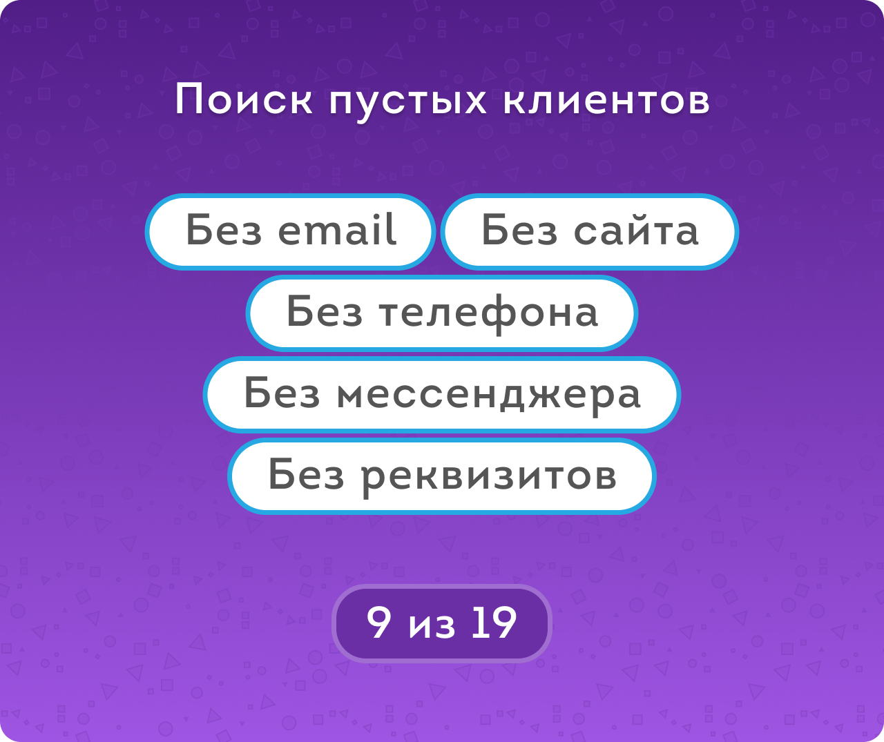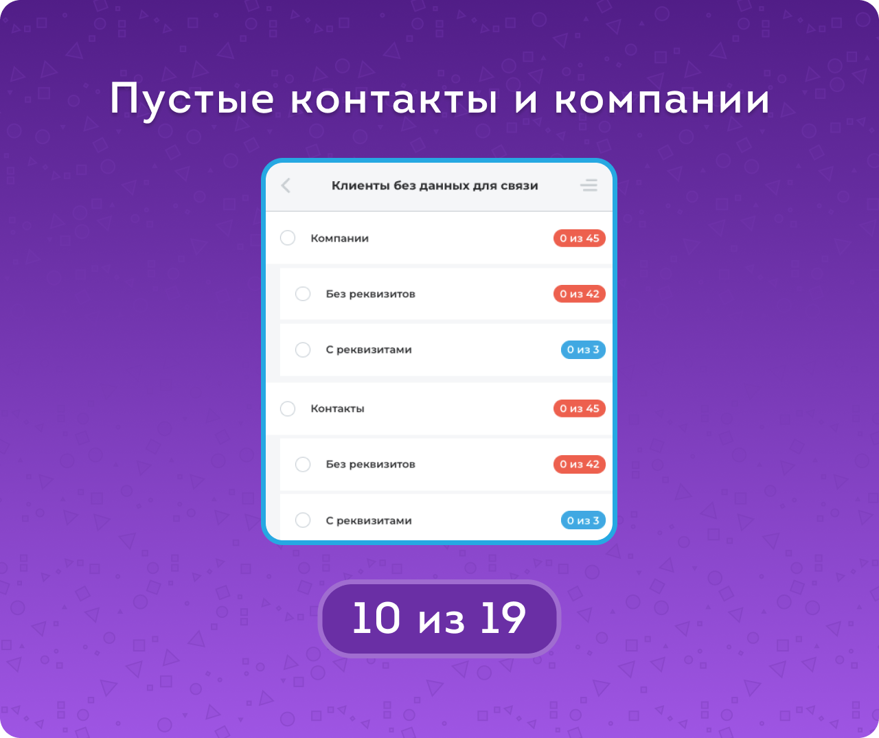 Очистка пустых клиентов поможет обнаружить и обработать бесполезных клиентов в CRM. Для этого приложение просканирует CRM и покажет общее количество Компаний и Контактов, у которых не заполнено ни одно из нужных полей. Если заполнено хотя бы одно, например, нет телефона, но есть мессенджер, либо есть связь со сделкой или счётом (или пустой контакт связан с заполненной компанией) — такой клиент не считается пустым. В отдельные категории вынесены те контакты и компании, у которых заполнены только реквизиты.