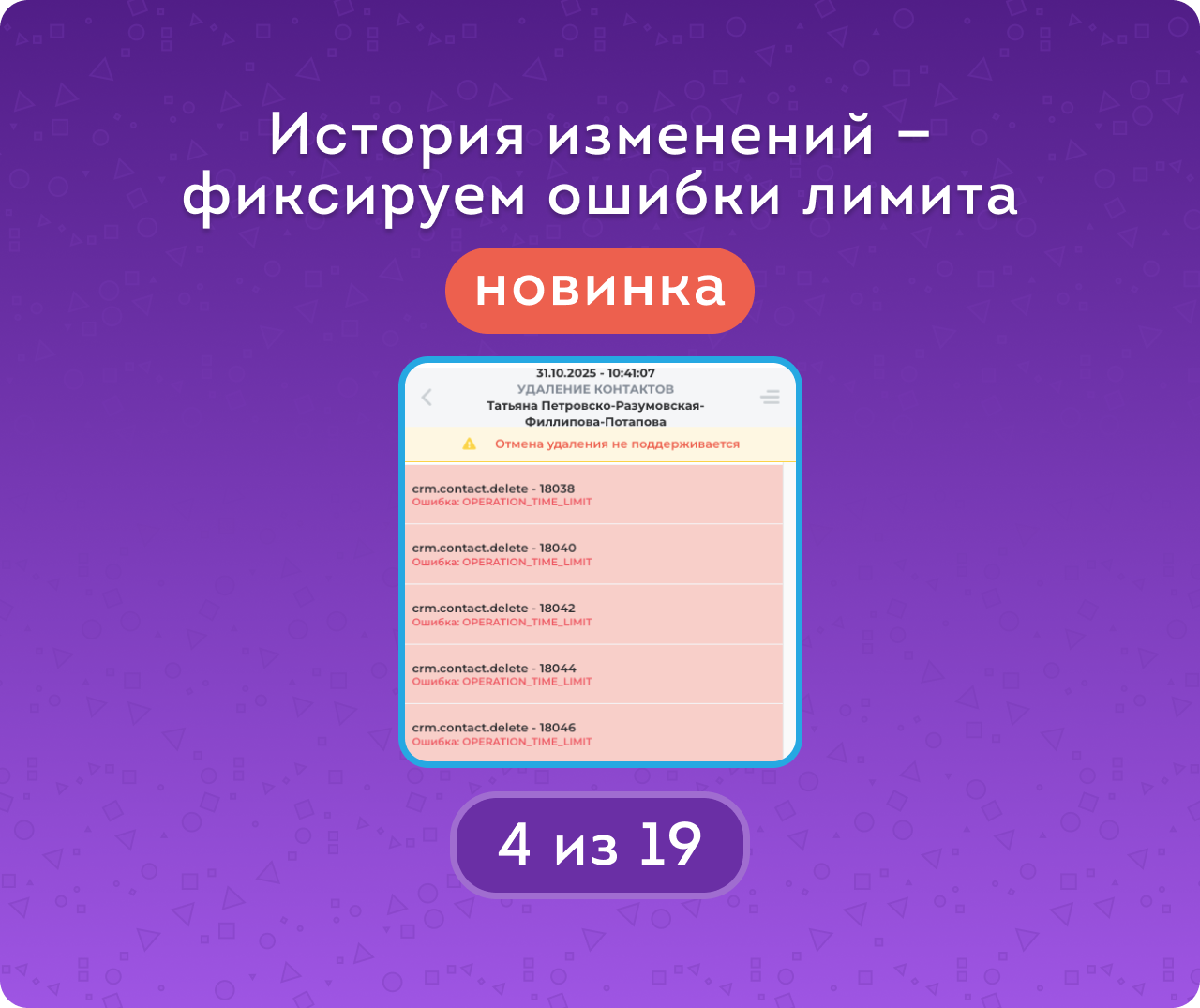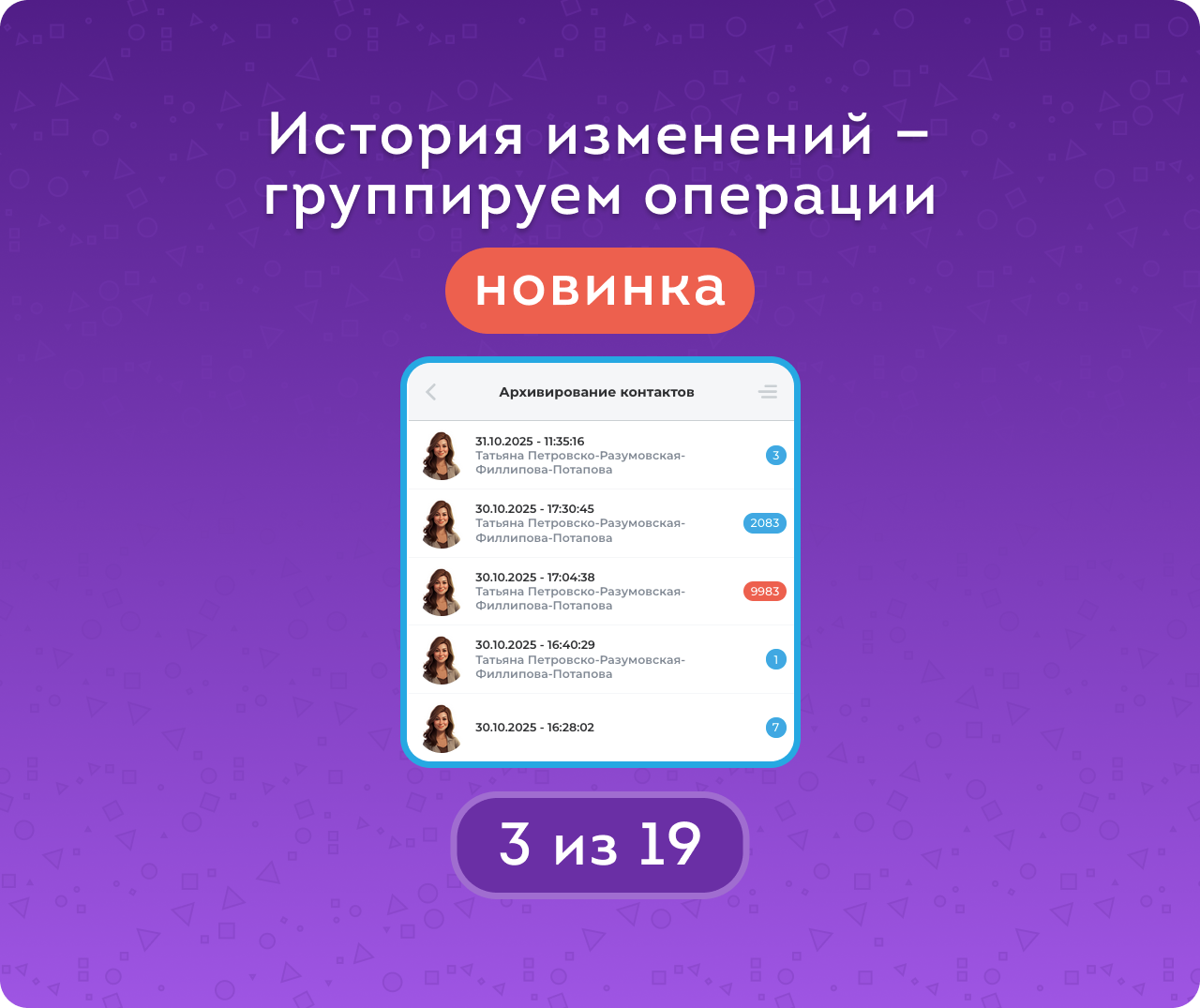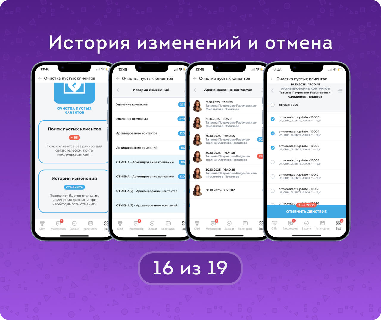 В Истории изменений фиксируются все действия — включая архивирование и удаление через приложение. Архивирование можно отменить, а удалённые данные восстанавливаются только вручную из корзины (в течение 30 дней). Отменять изменения может администратор портала, а остальные сотрудники видят лишь информацию о времени, пользователе и ID изменённого Контакта или Компании.