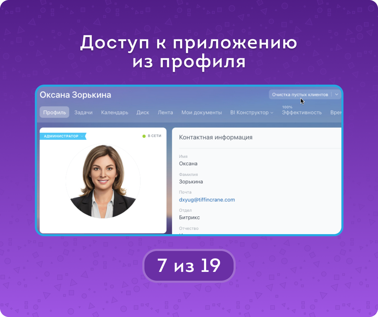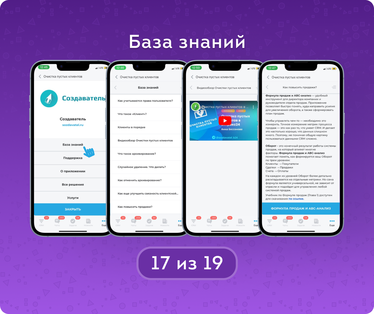 Кроме того, в приложении есть База знаний — в ней находятся инструкции, видео, а также ссылки на связанные решения. А во встройке в профиль пользователя отображаются только те компании и контакты, в которых он ответственный.