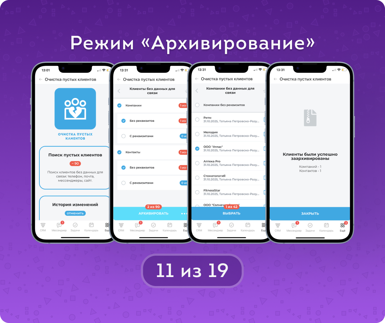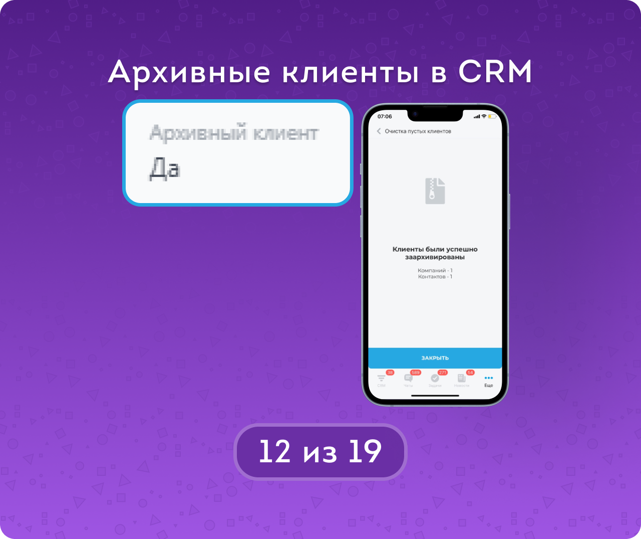 Под архивированием подразумевается следующее: в Контакте или Компании будет создано пользовательское поле Архивный клиент, значение которого будет «Да». Для чего это нужно? Используя этот режим и признак архивного клиента, вы сможете отделить самый бесполезный сегмент клиентов от всех остальных. При этом целостность не нарушается, ничего из CRM не удаляется, просто вы «маркируете» те сущности, которые не должны учитываться при аналитике, планировании рекламных компании или постановке задач менеджерам.