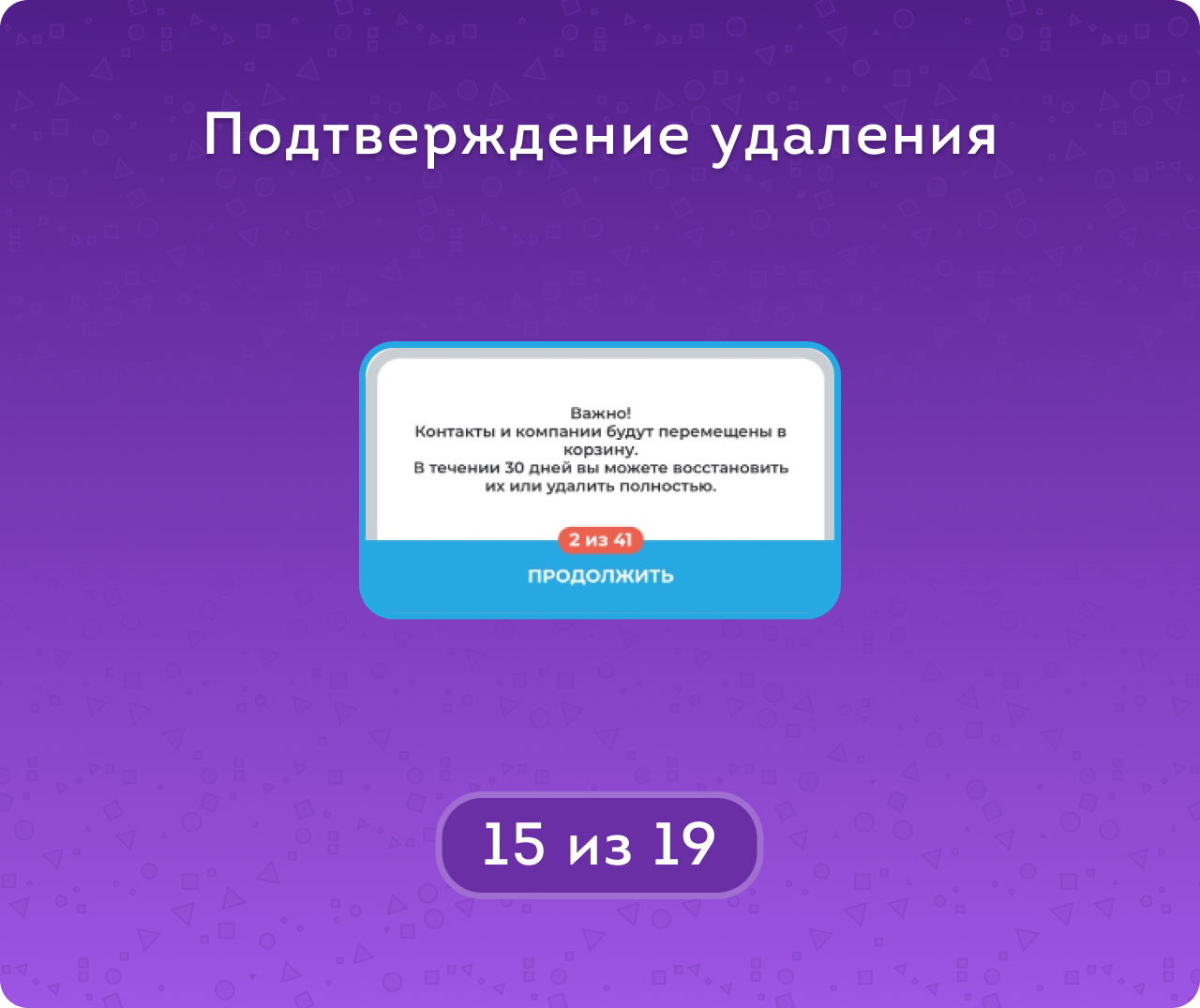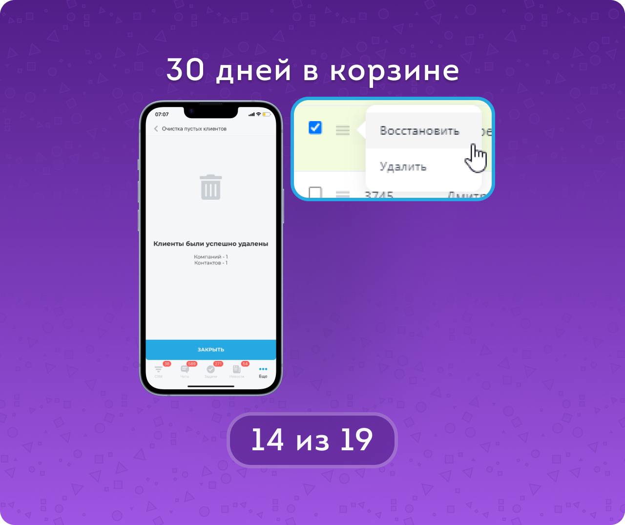При удалении выбранные пустые клиенты попадают в Корзину и хранятся там 30 дней. На коммерческих тарифах возможно их восстановление или полное удаление. На экране детального просмотра компаний и контактов отображается дата создания сущности, ссылка на неё, а также ФИО ответственного.