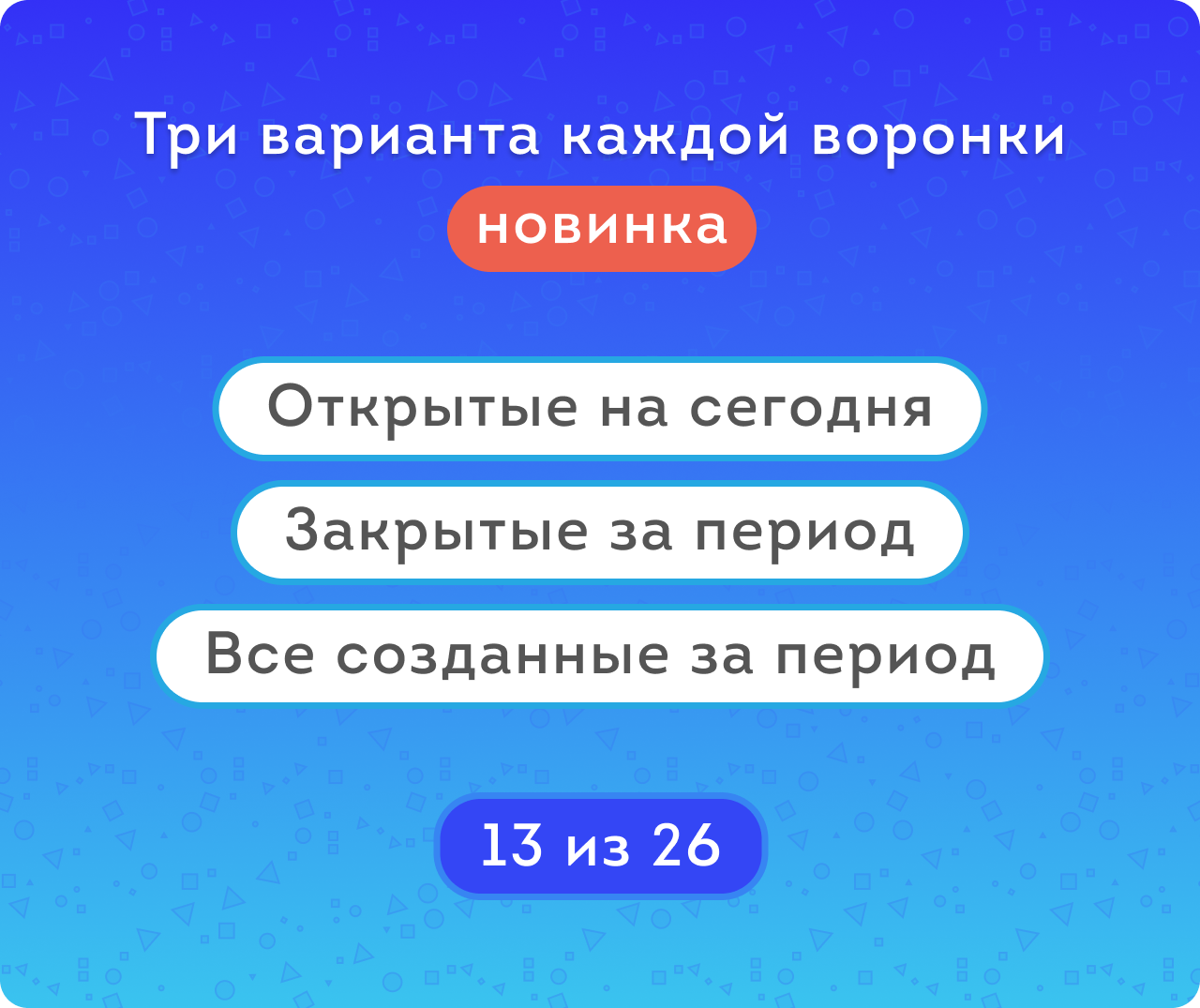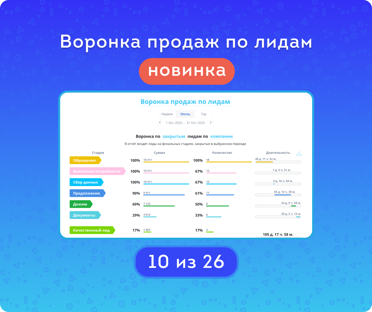Как и в воронках по сделкам и лидам, графики показывают динамику переходов между стадиями, конверсии и «узкие места» в процессах.