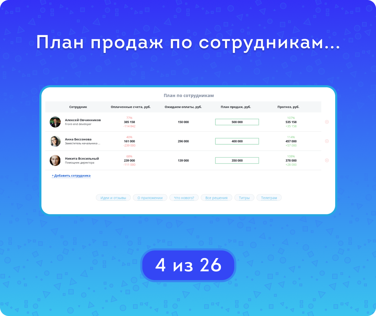 План по сотрудникам позволяет оценить текущую ситуацию в разрезе конкретных менеджеров, выяснить, кто успевает, а кому нужна помощь. А также его можно публиковать в ленту Новостей портала, например в начале месяца, и в конце — для подведения итогов.