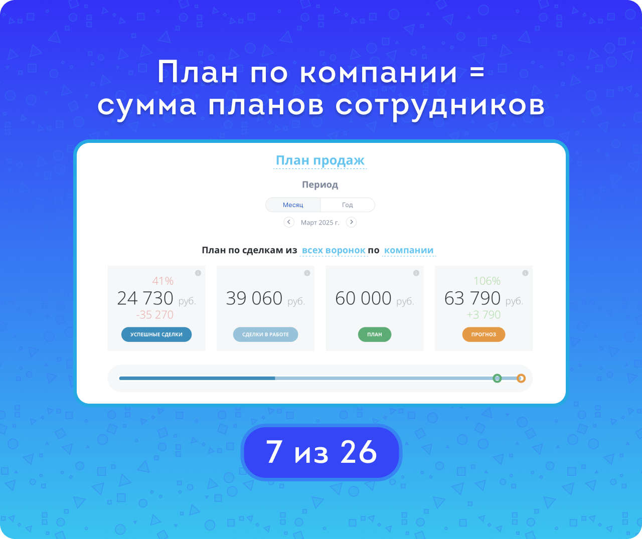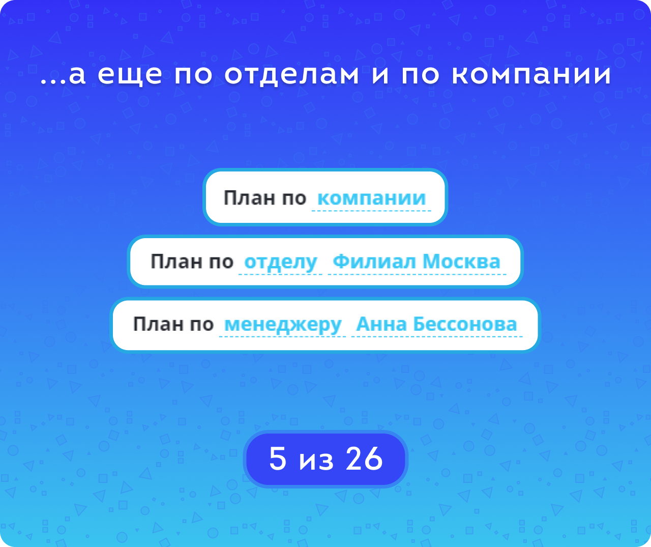 С планом продаж вы сможете не только задать цель вашим менеджерам, но и вовремя отследить прогресс и итоги выполнения!