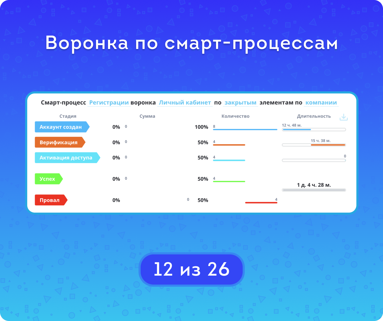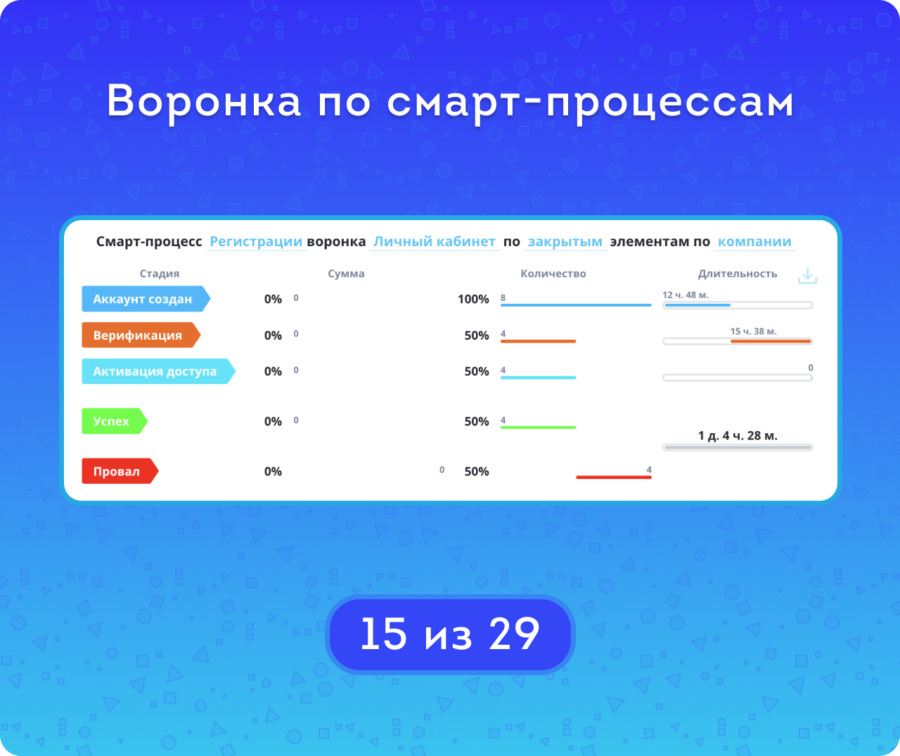 Анализ воронки доступен не только для продаж (лидов и сделок), но и для элементов смарт-процессов. Это особенно полезно, если вы используете их для проектной работы, заявок, заявлений, обслуживания или других нестандартных бизнес-процессов.