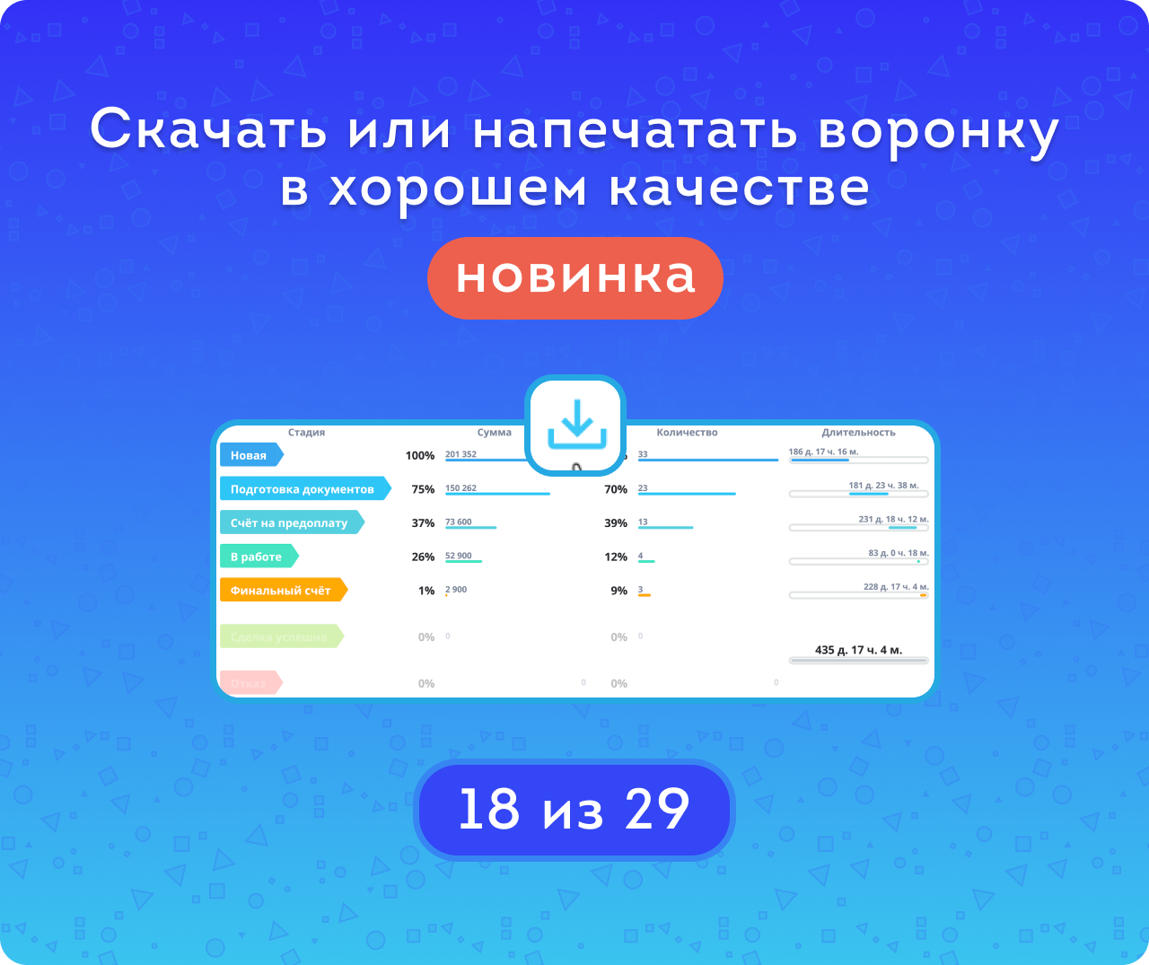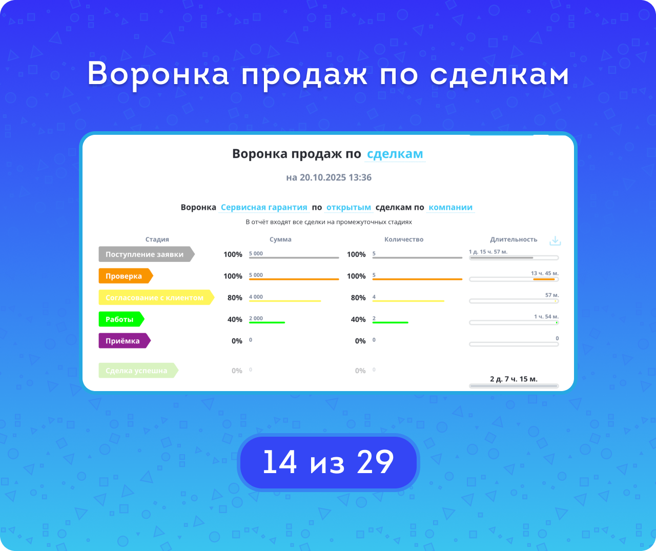 Если сделка находилась на стадии менее минуты, её длительность на ней будет нулевой — как и для успешных сделок, пропустивших какую-либо стадию. Кроме того, учитывается ситуация непоследовательного движения по стадиям. График позволяет выявить стадии с наибольшим количеством отказов и задержек, а также его можно скачать в хорошем качестве для печати.