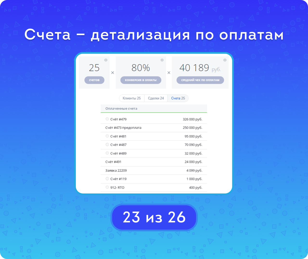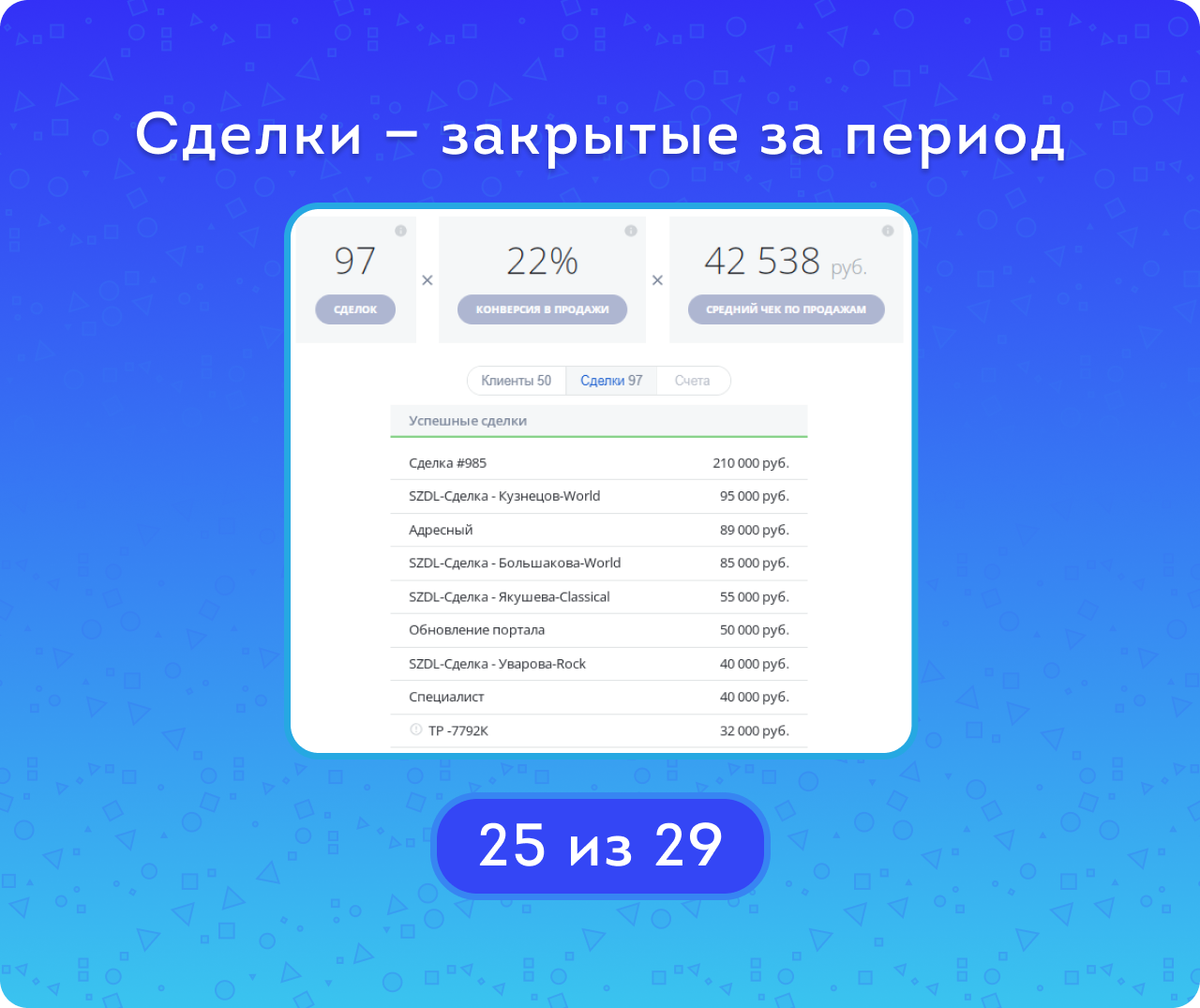 Конверсия — общее количество (Сделок, Счетов, Клиентов) делится на количество оплат (успешных Сделок, оплаченных Счетов, Покупателей).