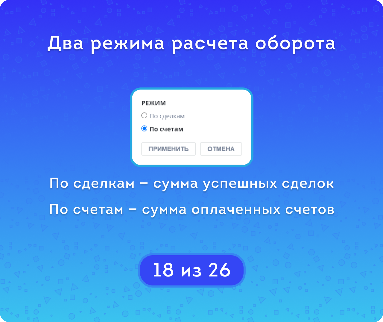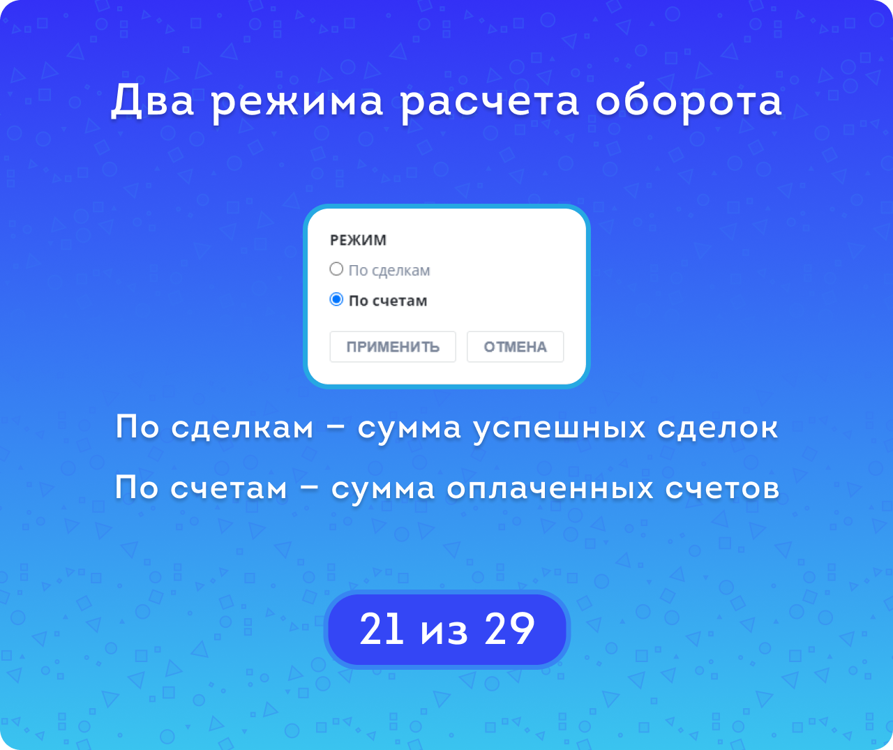 Оборот за период = сумма успешных Сделок или оплаченных Счетов.