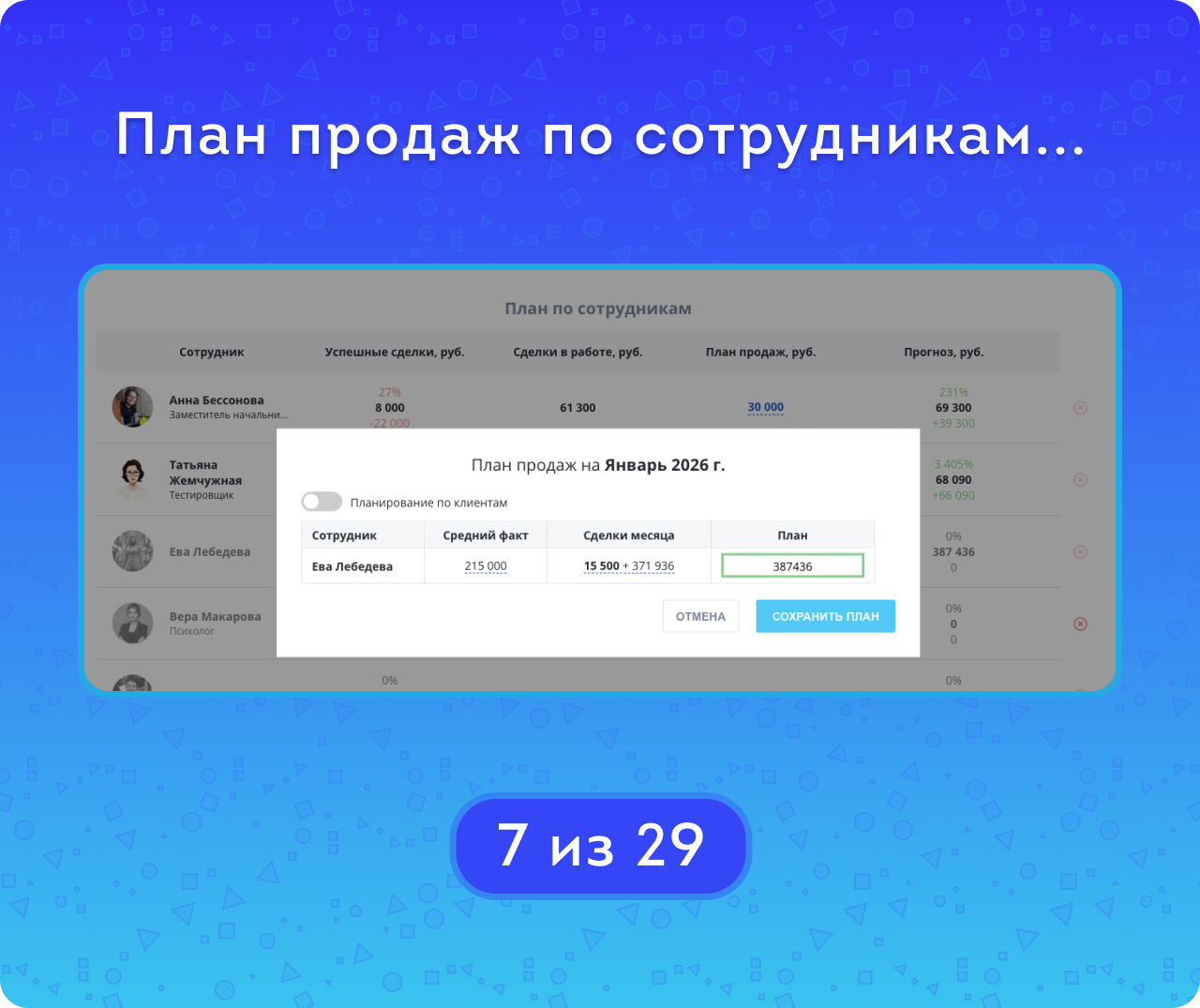 На отдельной вкладке вы сможете сформировать свой план продаж. Для этого нужно выбрать сотрудника (по умолчанию выводятся все, у кого есть Сделки или Счета) и задать сумму плана.