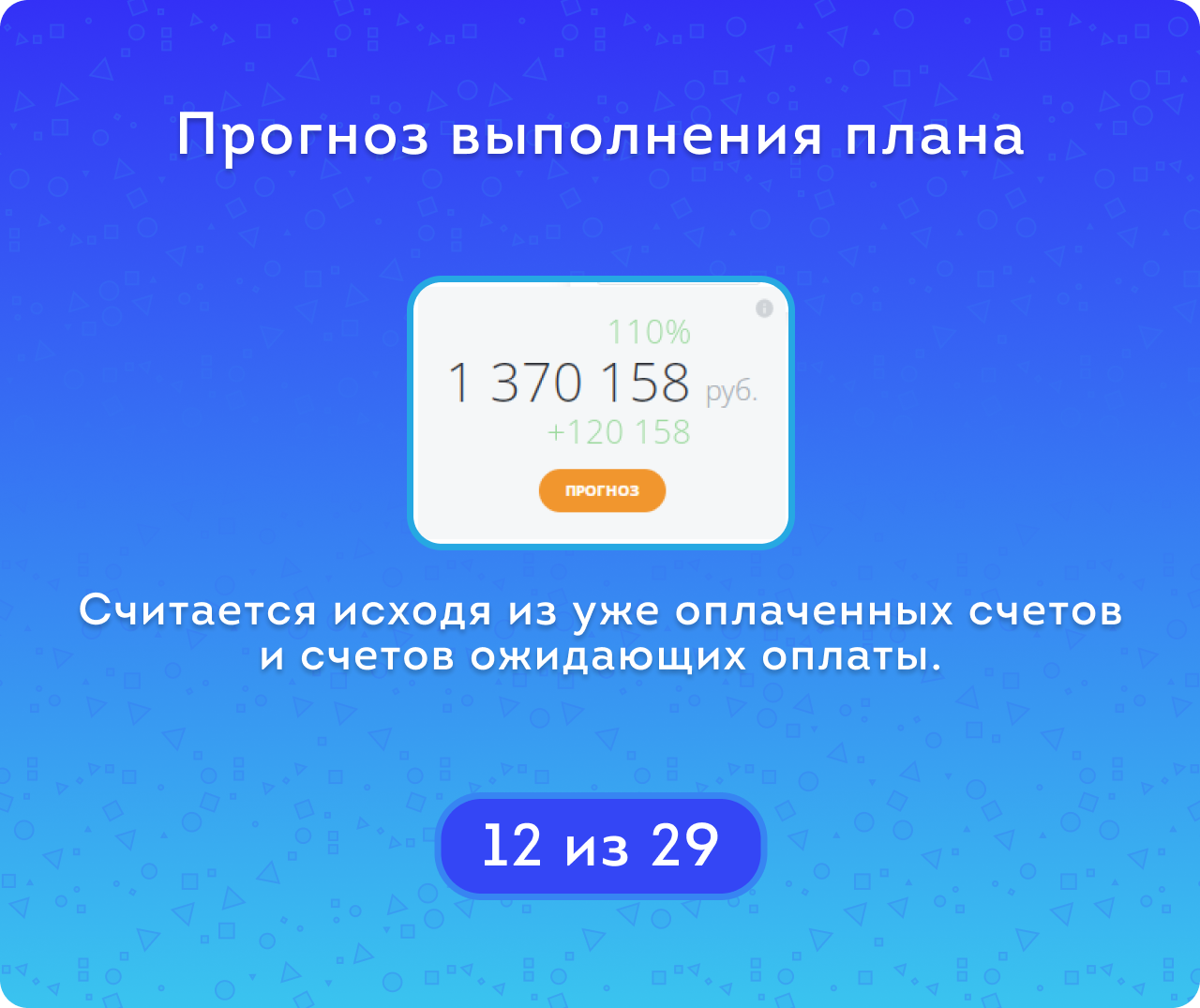 Средний факт — это сумма успешных сделок или счетов за последние три месяца, а также процент выполнения предыдущих планов. Сделки (или счета) месяца — это сумма уже полученных оплат за текущий период (выделяется жирным) плюс ожидаемые оплаты до конца текущего месяца.