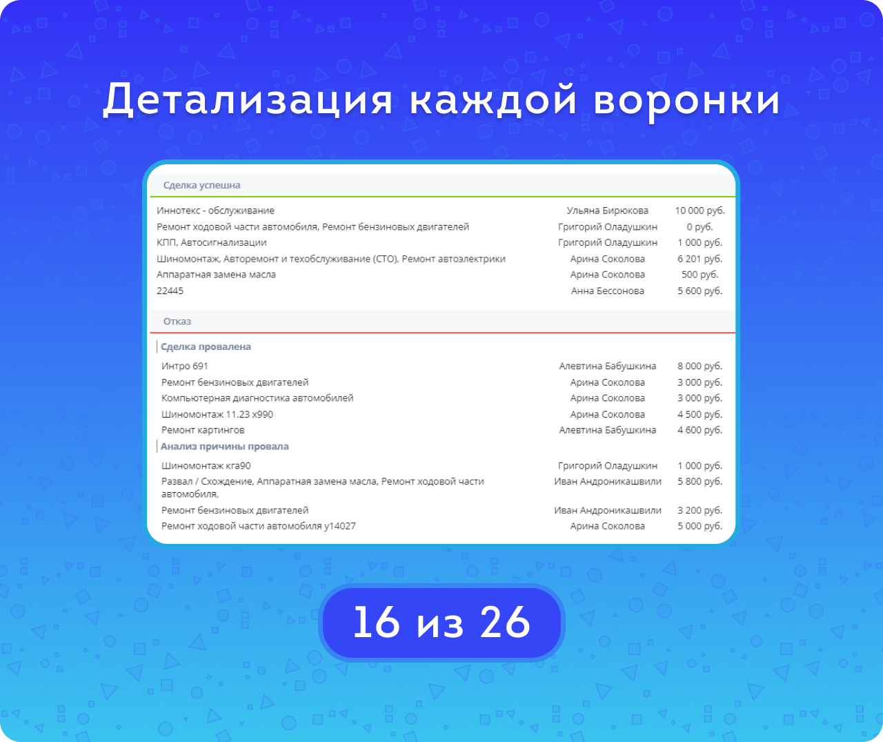 Под графиком находится таблица с детализацией по стадиям — для того, чтобы можно было убедиться в достоверности расчетов. В ней указаны: название каждой сделки, ответственный за неё, сумма и время нахождения на конкретной стадии. Те сделки, которые в настоящий момент находятся на стадии – выделены жирным шрифтом.