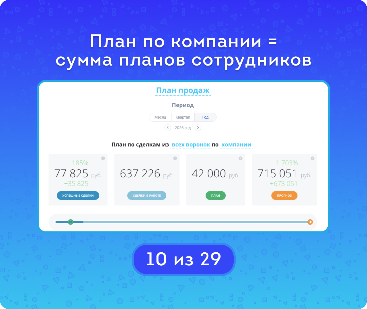 Выбор периода «год» позволит просмотреть (но не редактировать) сумму планов по месяцам. Аналогично для квартальных планов (NEW). План по сотрудникам позволяет оценить текущую ситуацию в разрезе конкретных менеджеров, выяснить, кто успевает, а кому нужна помощь. А также его можно публиковать в ленту Новостей портала, например в начале месяца, и в конце — для подведения итогов. С планом продаж вы сможете не только задать цель вашим менеджерам, но и вовремя отследить прогресс и итоги выполнения!