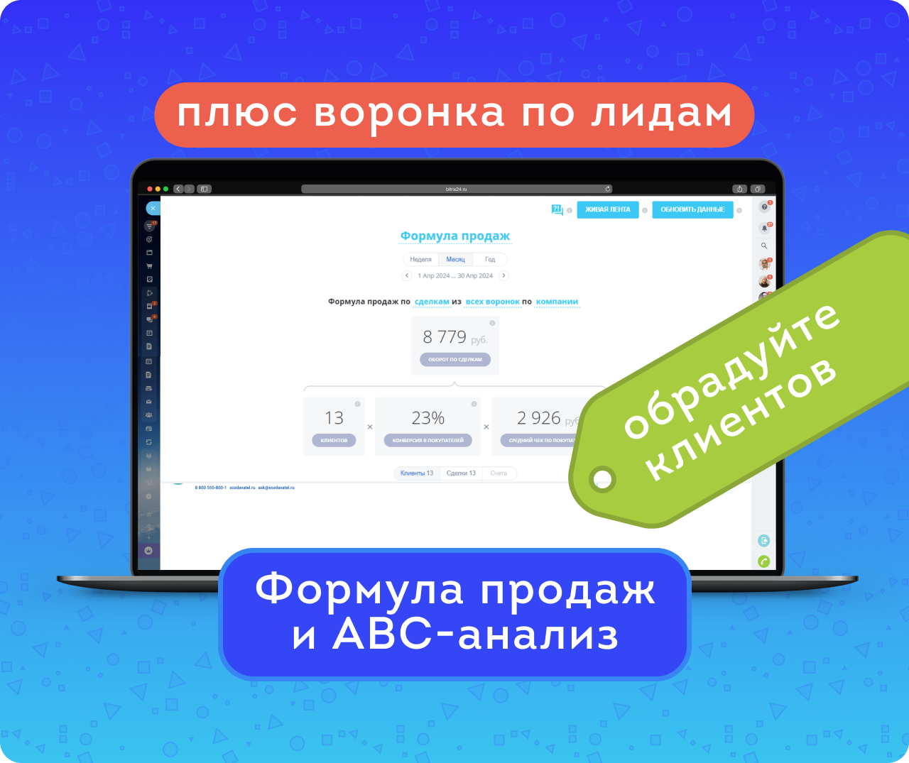 Формула продаж и ABC-анализ — комплекс инструментов для РОПа. Включает в себя сразу 5 режимов: саму Формулу, а также План продаж и три Воронки: по сделкам, по лидам (NEW) и по смарт-процессам. Приложение позволяет быстро понять, куда направить усилия для увеличения оборота. Разработано на основании учебника «Формула продаж»