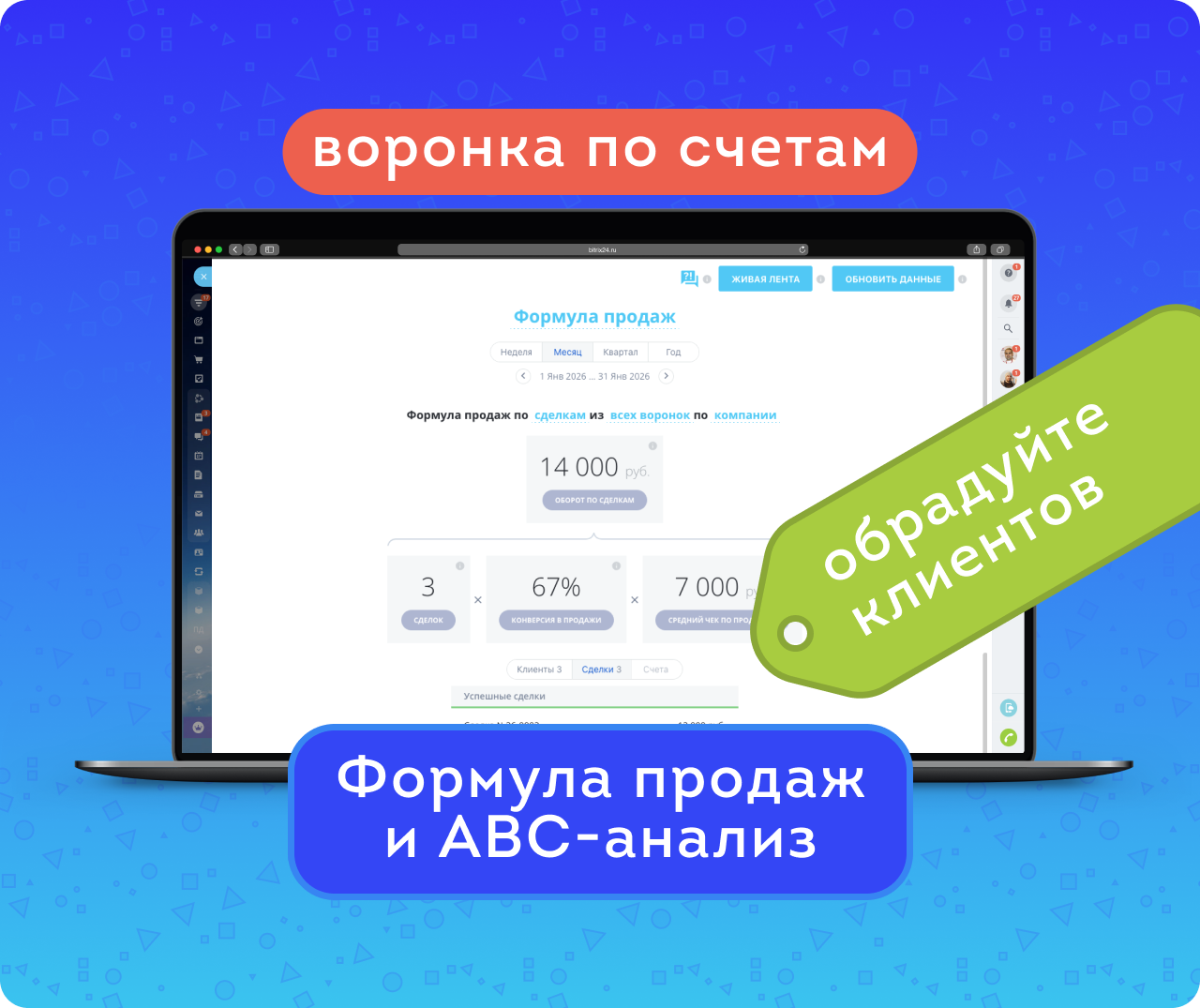 Формула продаж и ABC-анализ — комплекс инструментов для РОПа. Включает в себя сразу 6 режимов: саму Формулу, а также План продаж и четыре Воронки: по сделкам, по лидам, по счетам (NEW) и по смарт-процессам. Приложение позволяет быстро понять, куда направить усилия для увеличения оборота. Разработано на основании учебника «Формула продаж»