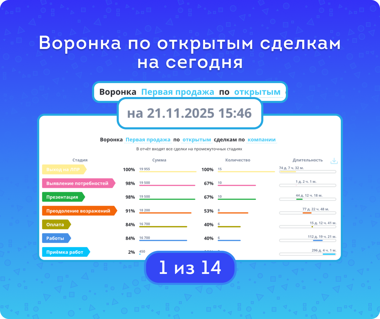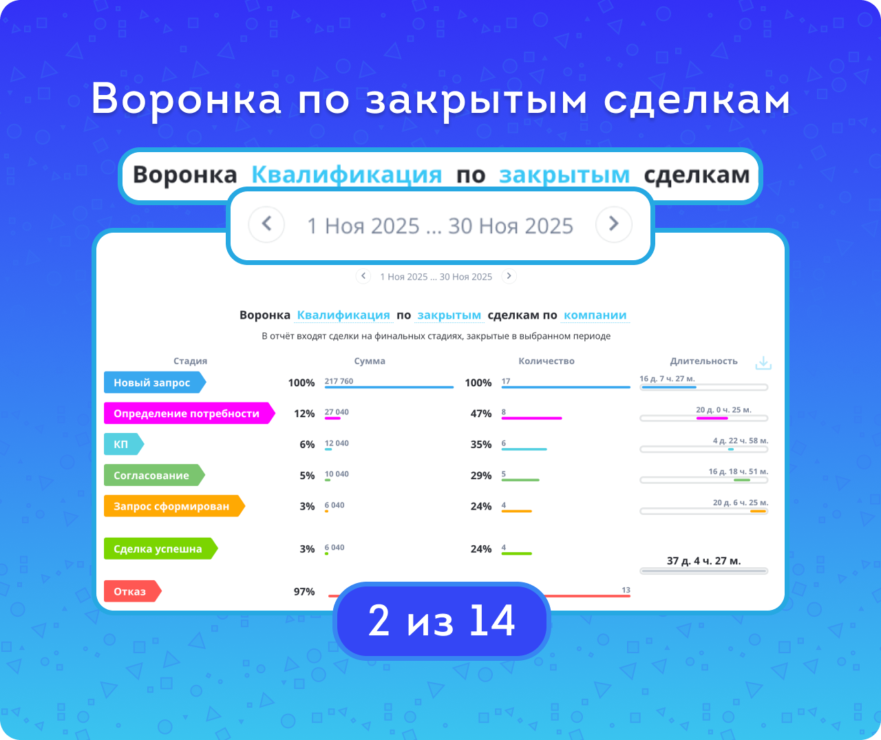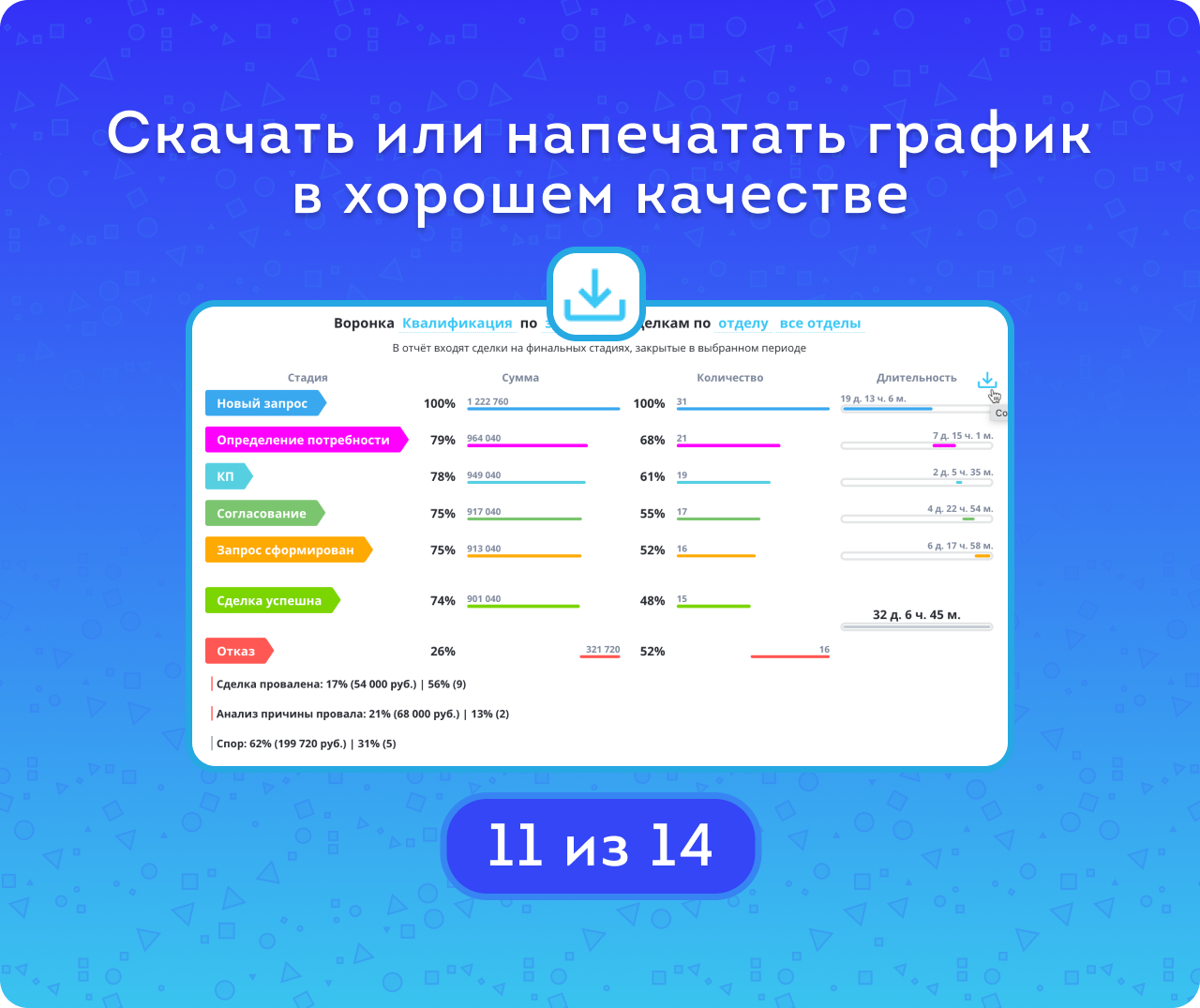 Если сделка находилась на стадии менее минуты, её длительность на ней будет нулевой — как и для успешных сделок, пропустивших какую-либо стадию. Кроме того, учитывается ситуация непоследовательного движения по стадиям. График позволяет выявить стадии с наибольшим количеством отказов и задержек, а также его можно скачать в хорошем качестве для печати.