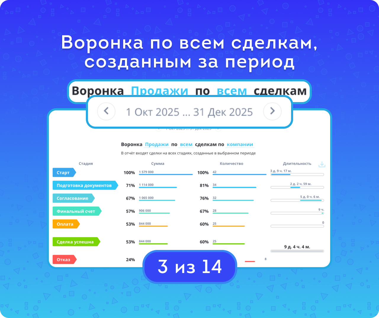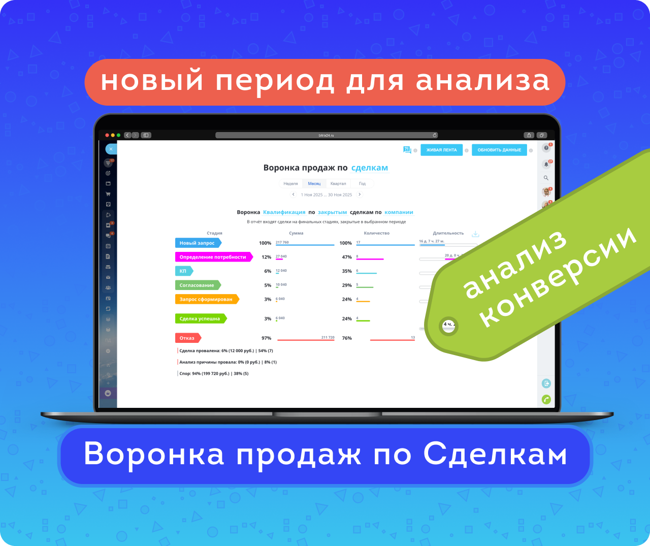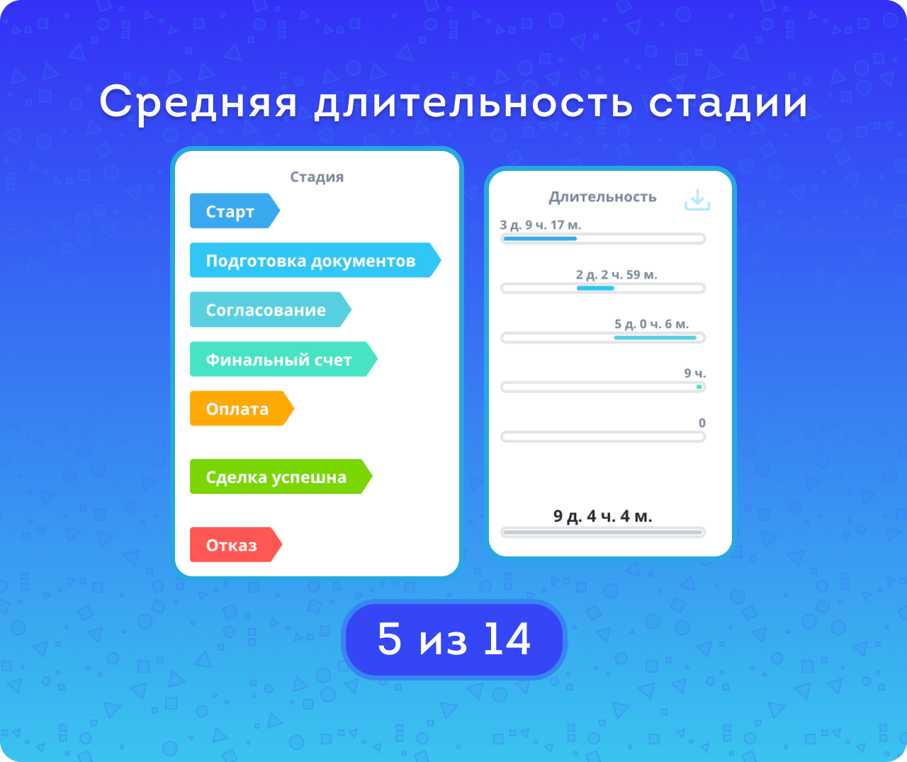 Если сделка находилась на стадии менее минуты, её длительность на ней будет нулевой — как и для успешных сделок, пропустивших какую-либо стадию. Кроме того, учитывается ситуация непоследовательного движения по стадиям. График позволяет выявить стадии с наибольшим количеством отказов и задержек, а также его можно скачать в хорошем качестве для печати.