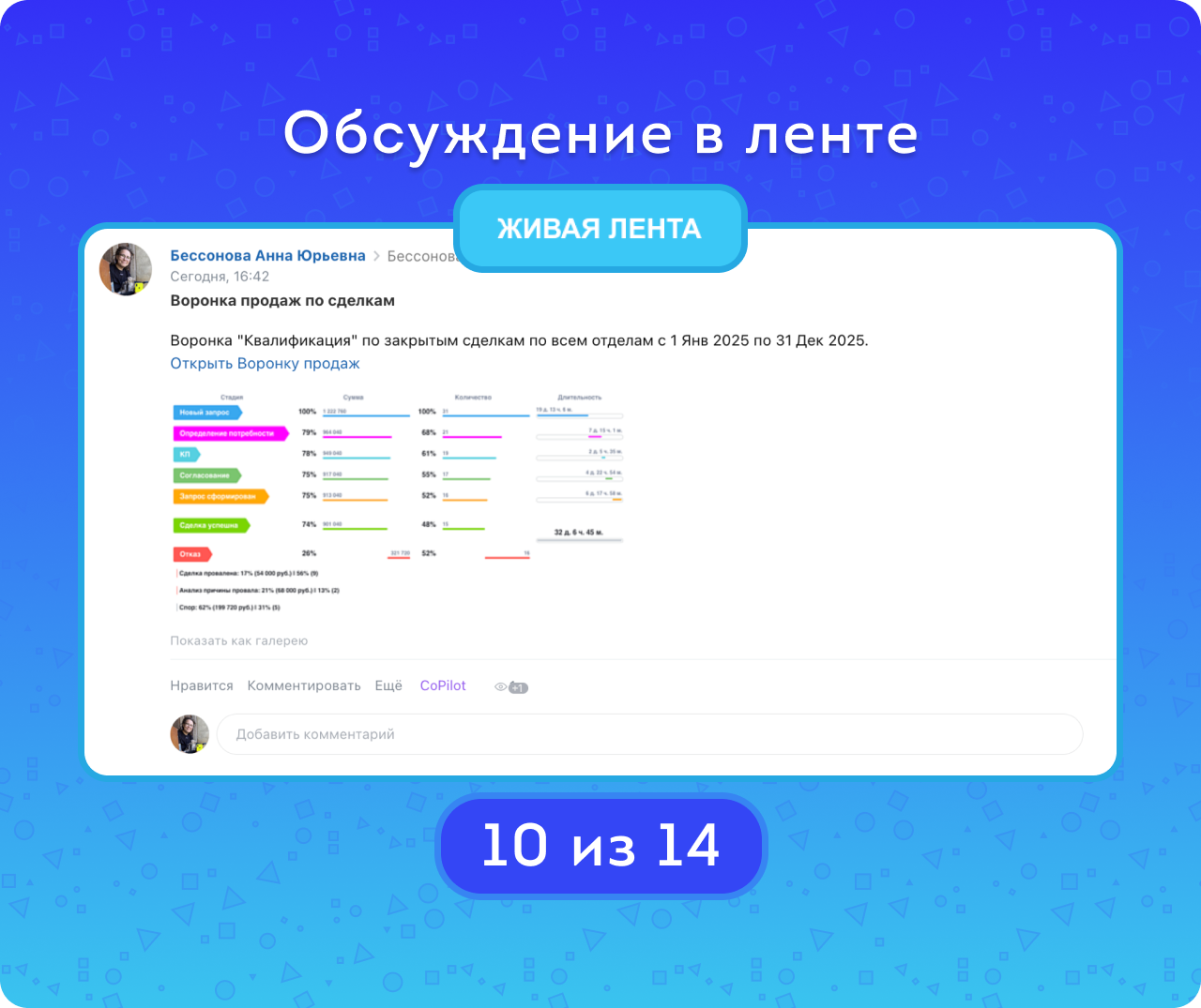 В комплексной Воронке продаж для анализа доступны не только сделки, но и лиды, счета и смарт-процессы. Это даёт сквозную картину движения клиента и полный контроль над точками роста. Кроме того, вам может быть полезен учебник Формула продаж – он доступен по ссылке