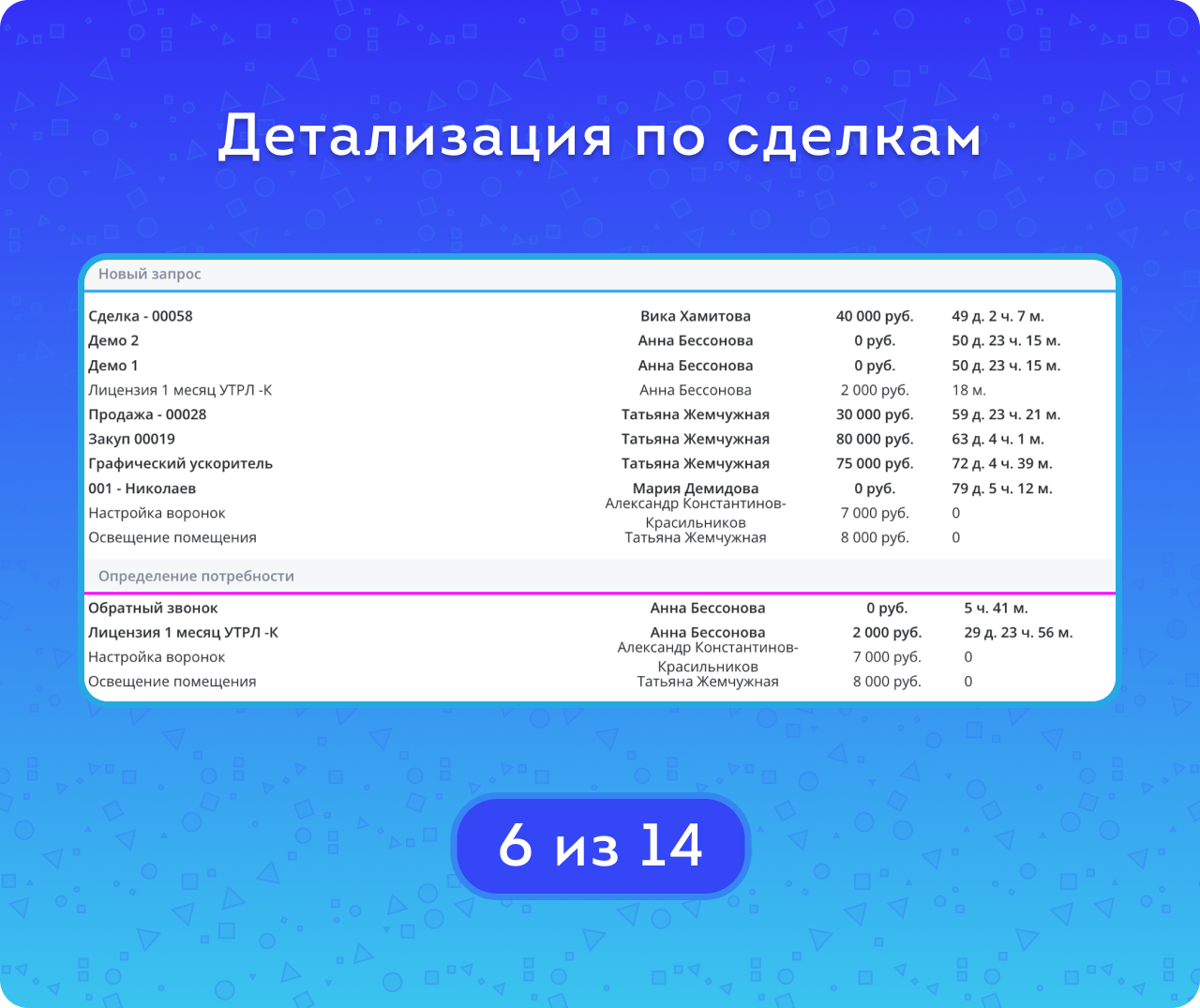 Под графиком находится таблица с детализацией по стадиям — для того, чтобы можно было убедиться в достоверности расчетов. В ней указаны: название каждой сделки, ответственный за неё, сумма и время нахождения на конкретной стадии. Те сделки, которые в настоящий момент находятся на стадии – выделены жирным шрифтом.