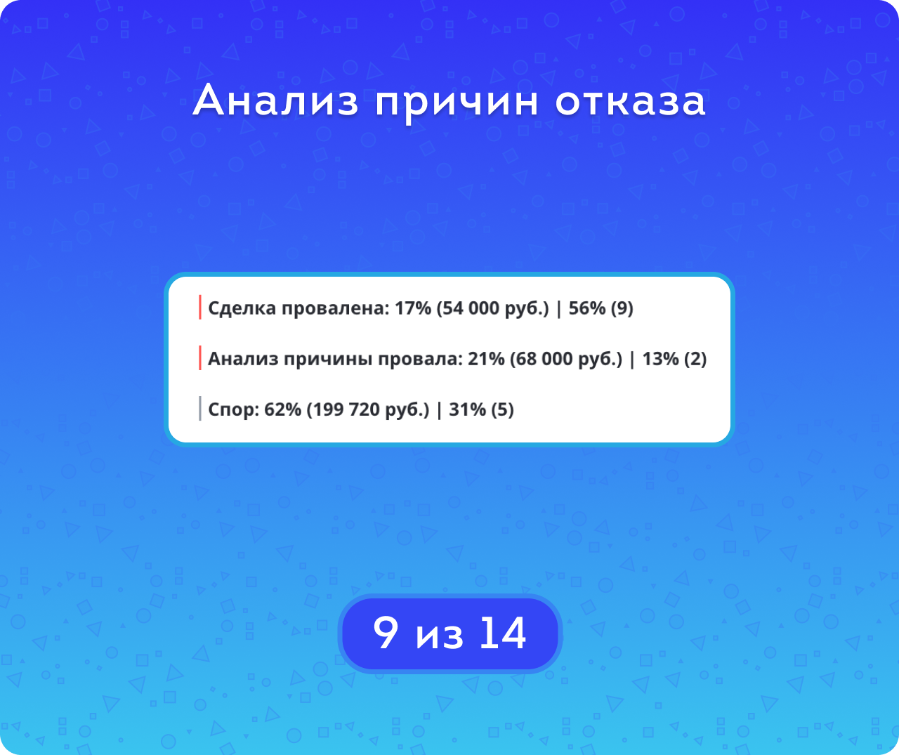 Помимо общих показателей по сумме, количеству и конверсии отказа, вы можете более подробно изучить причины неудач для разных провальных стадий, и улучшить эффективность продаж. А если нужно построить отчет по другим полям, либо в связке со счетами, контактами или компаниями — воспользуйтесь Мастером отчетов CRM.