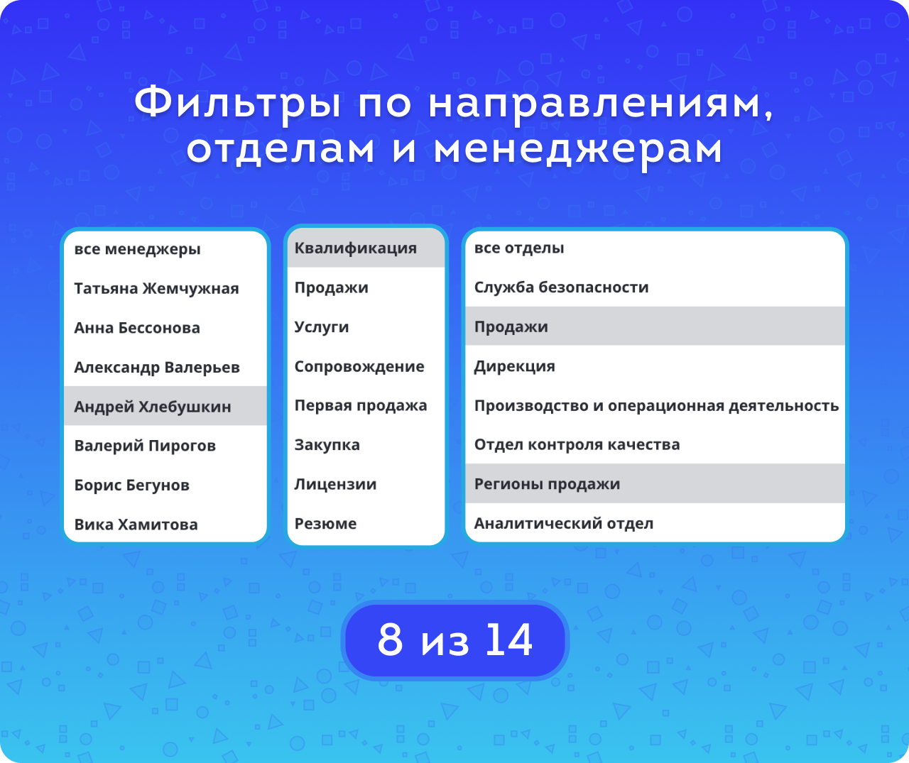 Кроме того, доступны фильтры по компаниям, отделам (можно выбрать несколько) и менеджерам. Это удобно для сравнения эффективности подразделений или сотрудников.