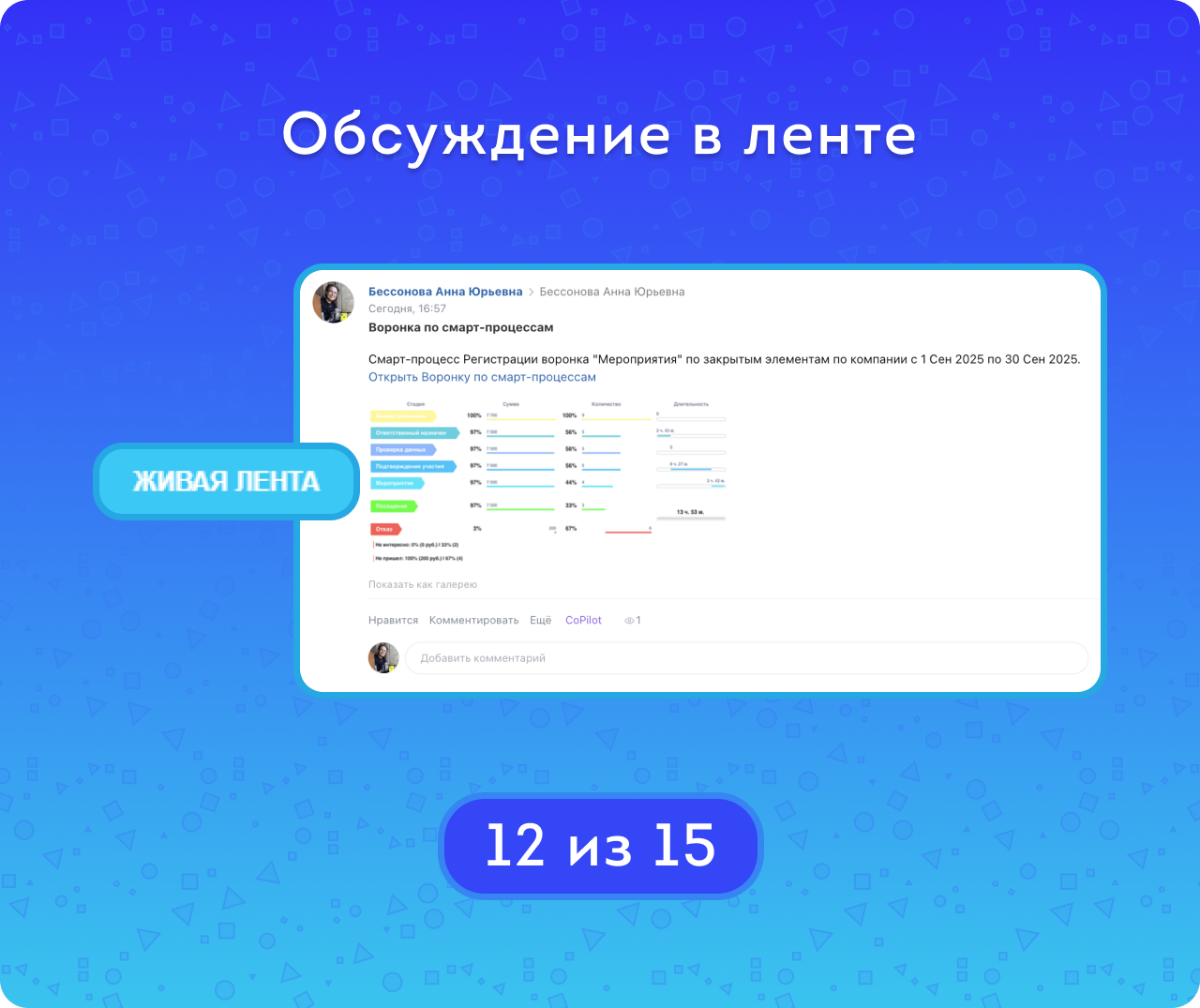 В комплексной Воронке продаж для анализа доступны не только смарт-процессы, но и лиды, сделки и счета. Это даёт сквозную картину движения клиента и полный контроль над точками роста.