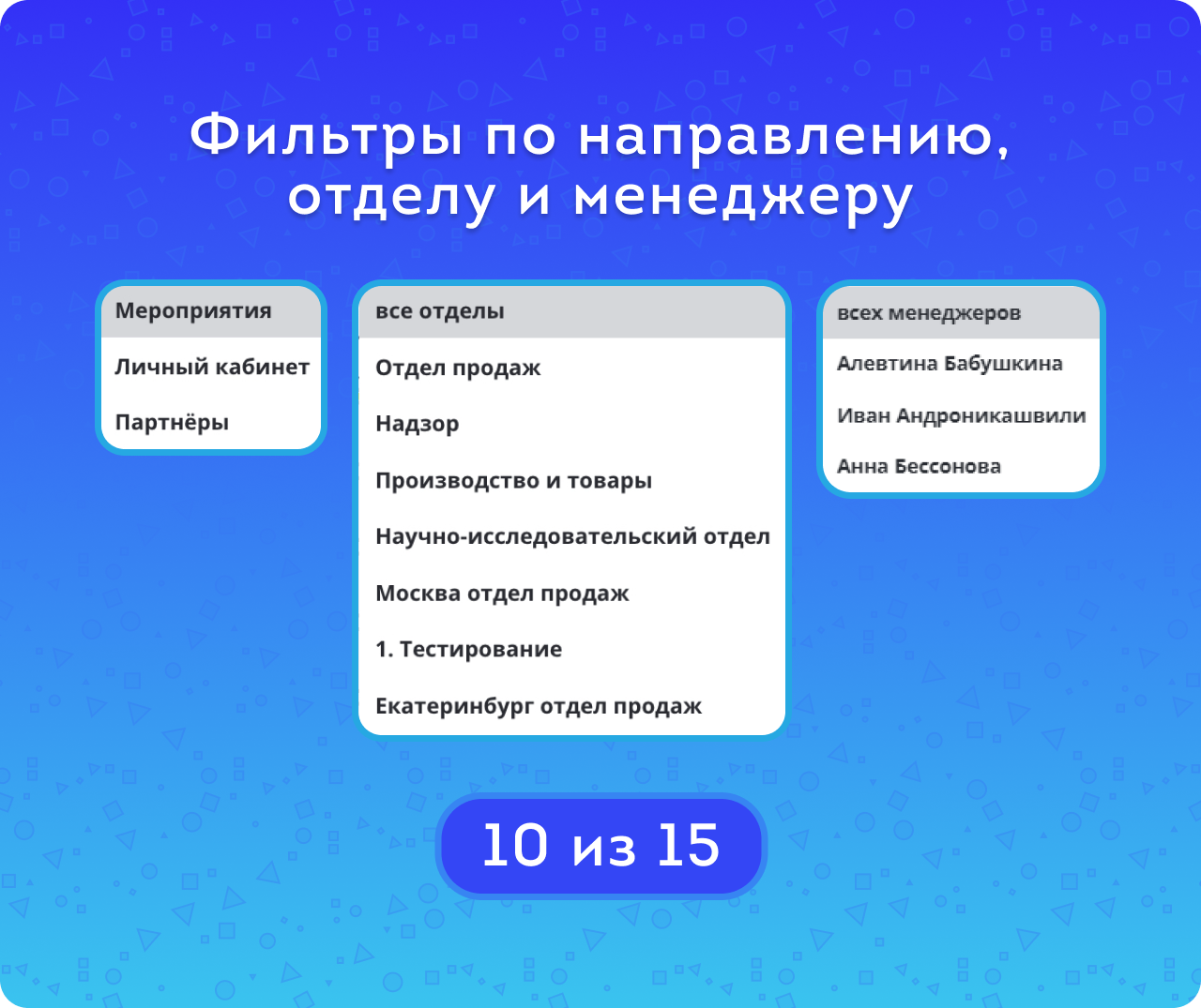 Воронка по Смарт-процессам – мощный инструмент для контроля и анализа работы команды. А для построения гибких отчетов используйте Мастер отчетов по смарт-процессам.В нем можно выбирать данные по пользовательским полям, добавлять данные из сделок и лидов, а также настраивать регулярные отчеты.