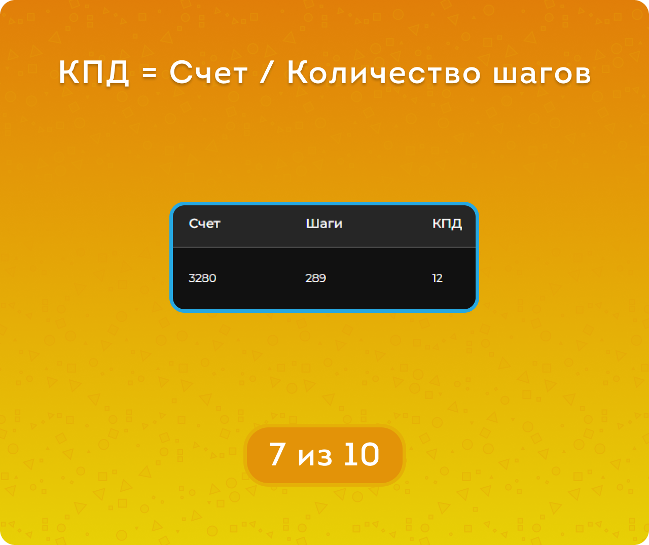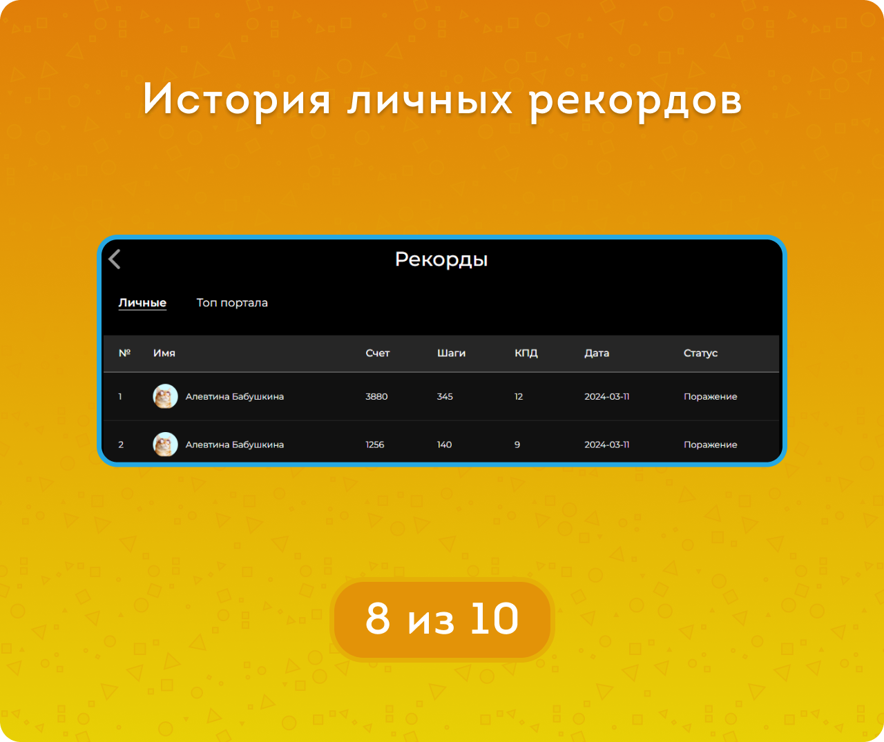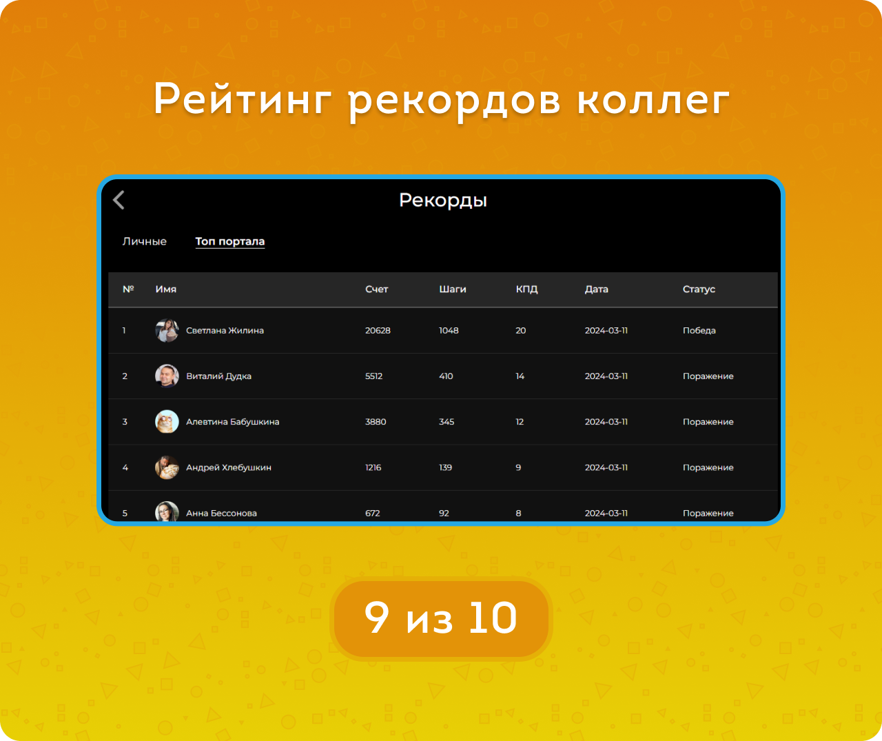 В игре также учитывается счет и количество ходов. Сохраняется история игр и личный рекорд. Для соревнования между сотрудниками строится рейтинг игроков на портале, рекорды сортируются по КПД = Счёт / Количество шагов.