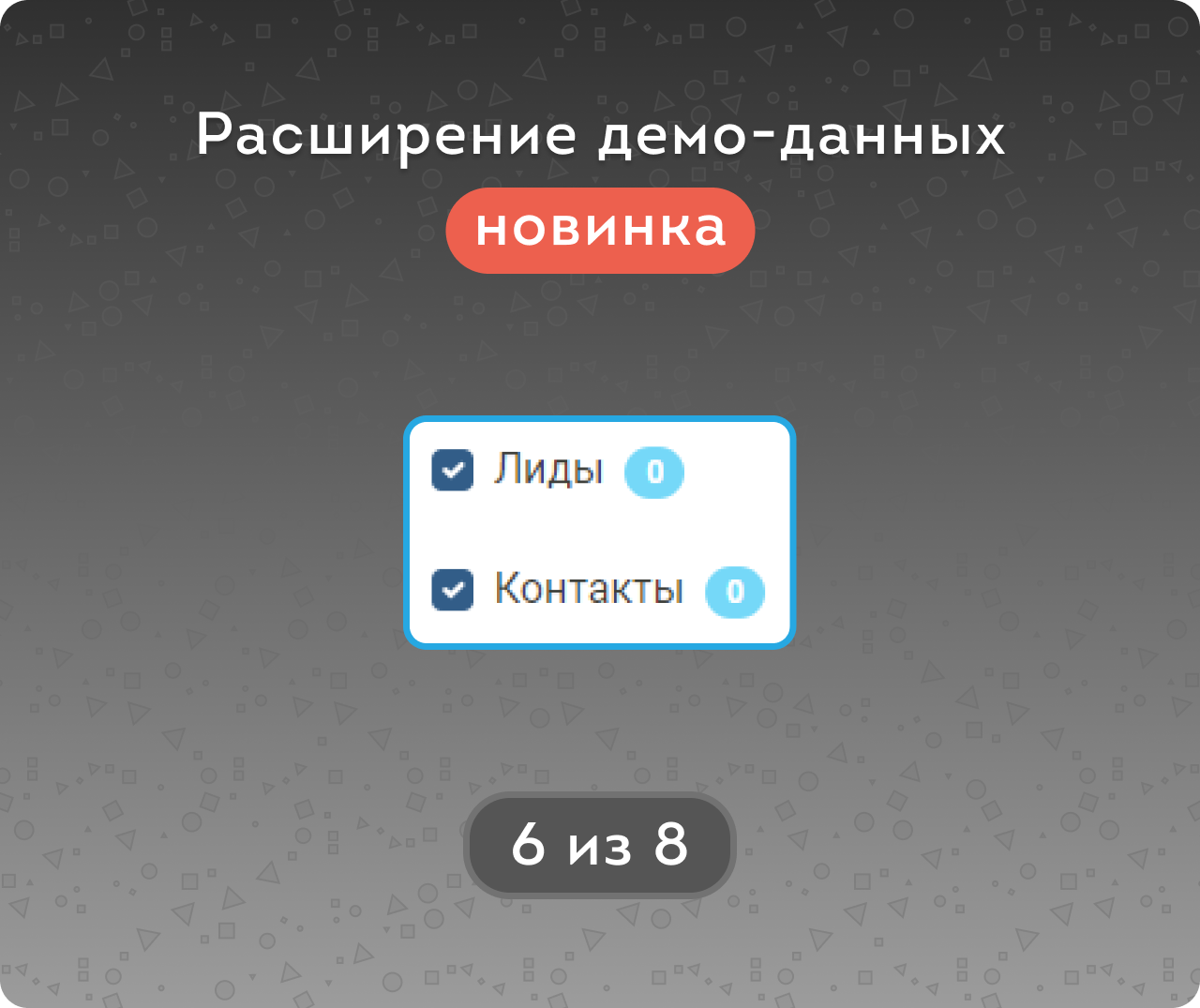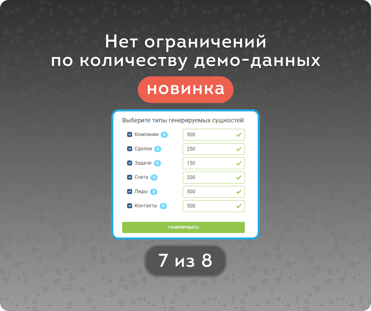Генератор данных CRM поможет интеграторам Битрикс24 не тратить время на наполнение CRM или импорт тестовых баз. А после проведения обучения, демонстрации функционала CRM или тестирования порталов — все демо-данные можно удалить в один клик.