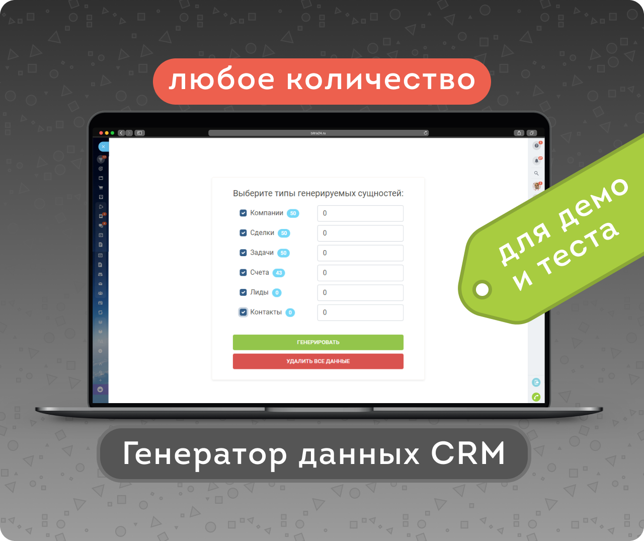 Генератор данных CRM — приложение, которое быстро создаст и удалит данные для CRM Битрикс24. Полезно как для обучения сотрудников, так и для оценки производительности портала.