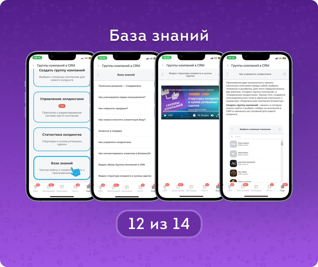 Для того, чтобы пользователю было удобно ориентироваться в приложении — предусмотрена База знаний. В ней находятся ответы на часто задаваемые вопросы, полезные видео и ссылки на помогающие приложения.