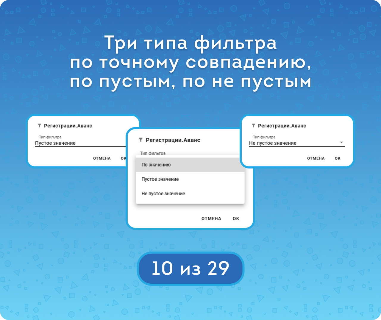- Менять типы фильтров: по значению, по пустым и по не пустым значениям.