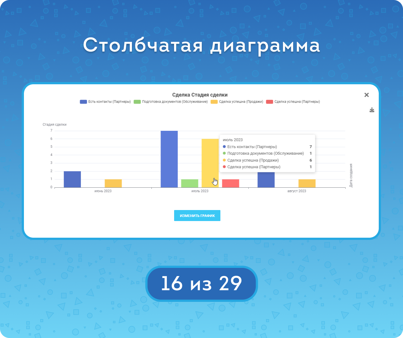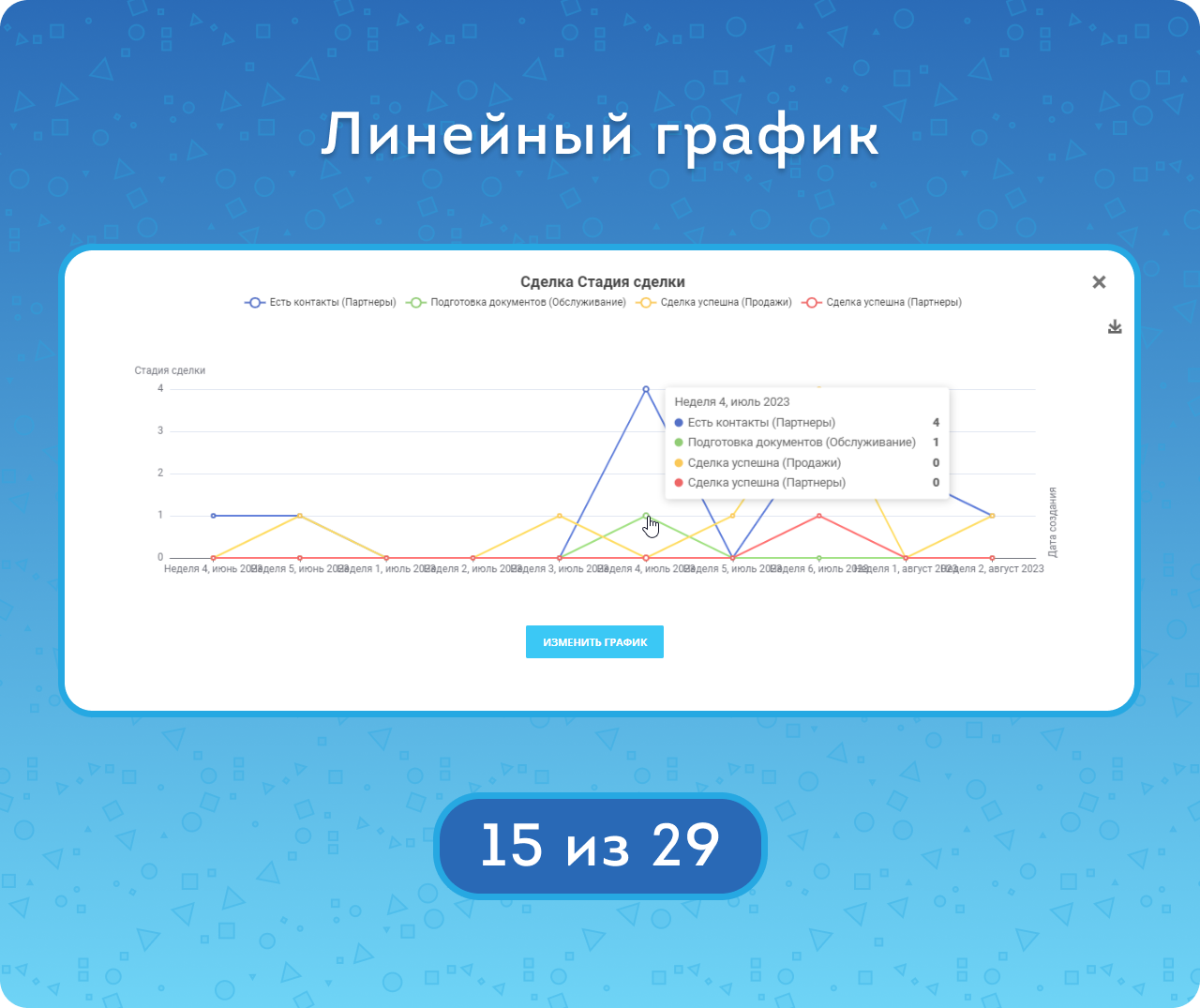 Для того, чтобы выделить в вашем отчете самое важное — используйте графики. Так воспринимать информацию станет проще. Кнопка «Построить график» находится под таблицей, можно выбрать тип графика и подходящие поля для осей Икс (любая дата) и Игрек (числовые и списочные поля).