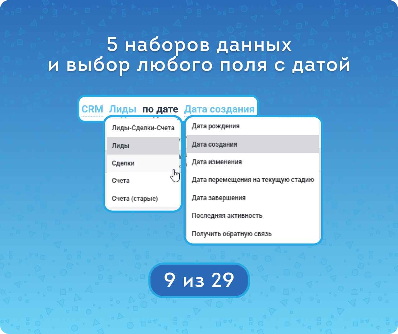 - Менять дату, по который происходит выборка данных. Например, выбирать Лидов по Дате завершения, или вообще по пользовательским полям. Для этого предусмотрены отдельные режимы.