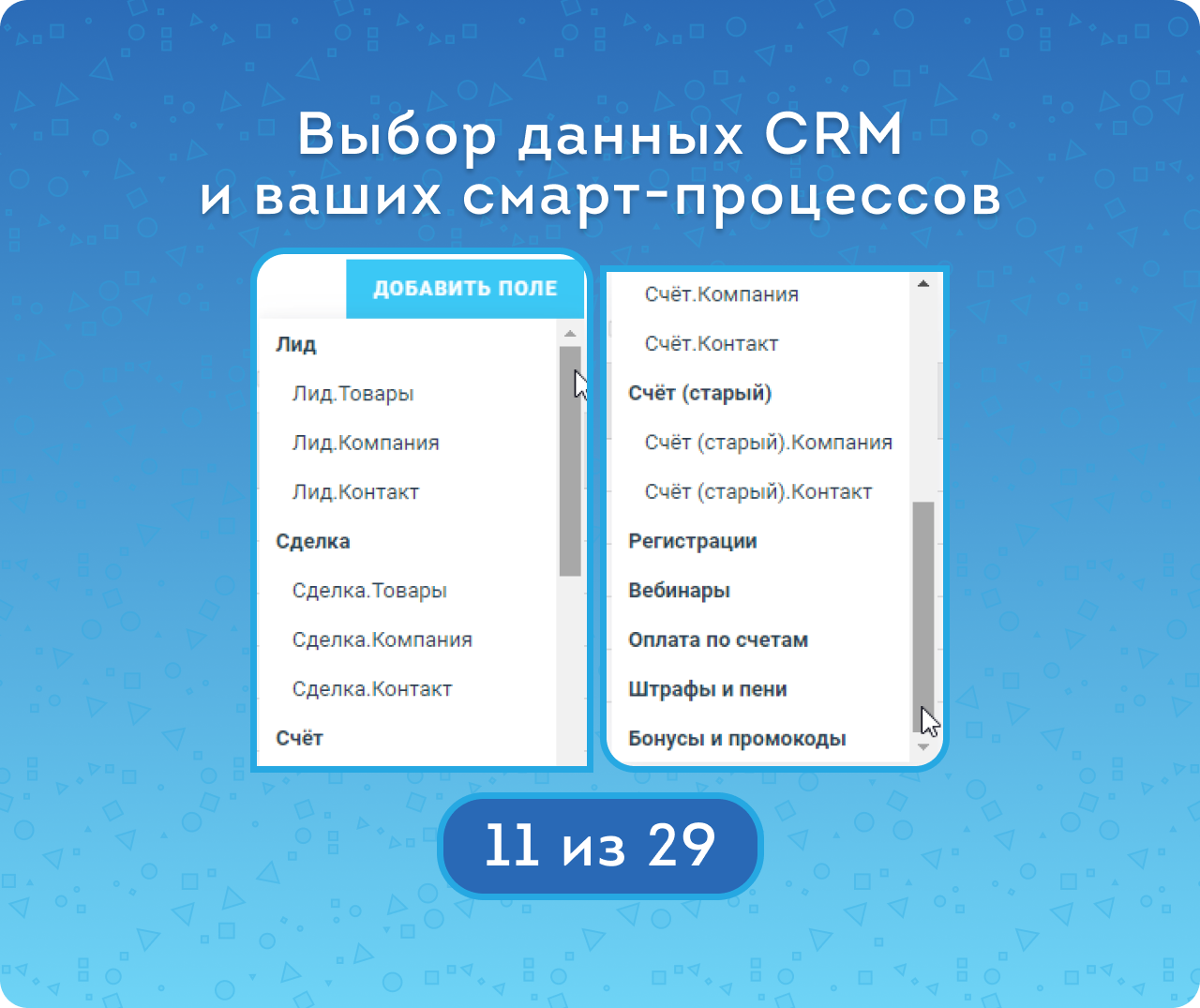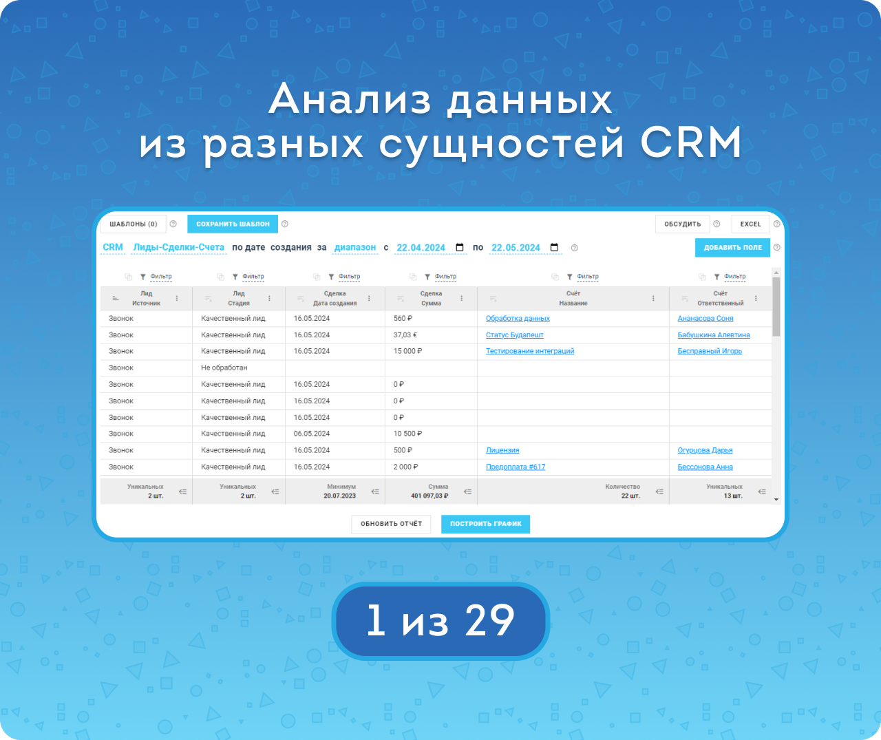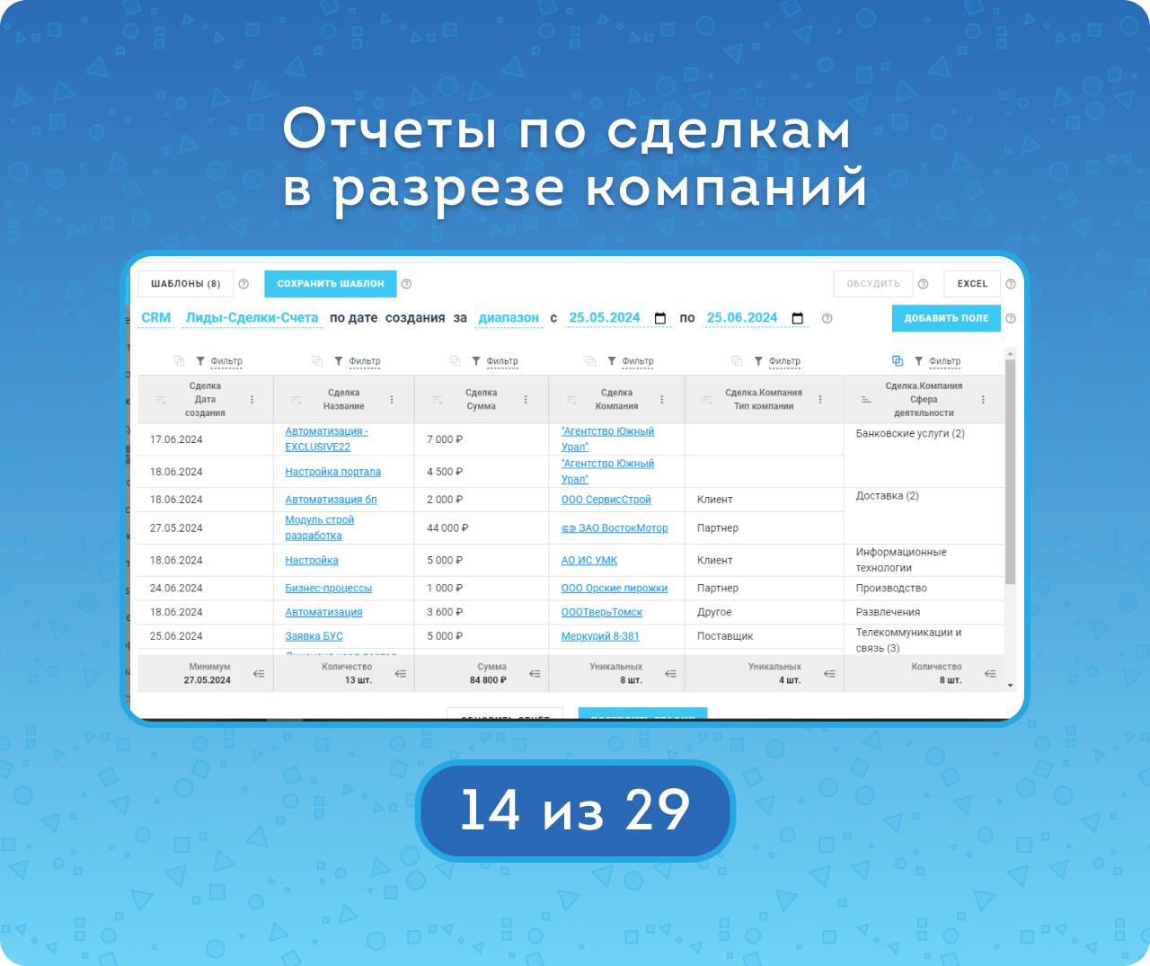 - Формировать отчетность по смарт-процессам, связанным с Лидами, Сделками и Счетами.