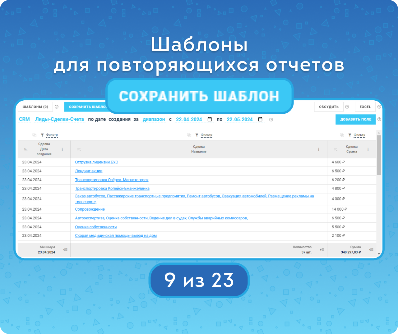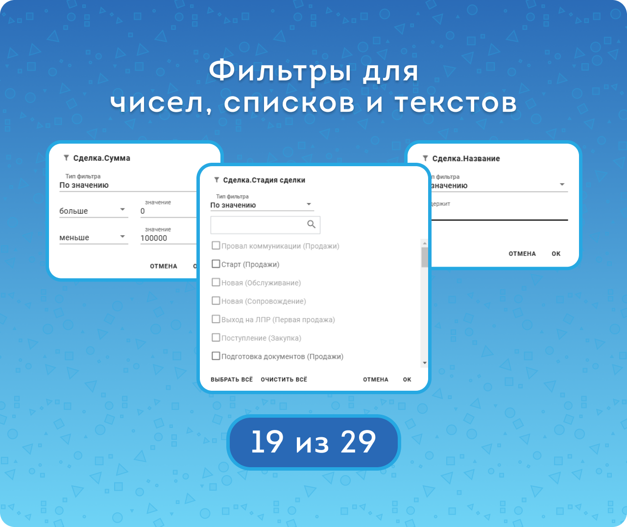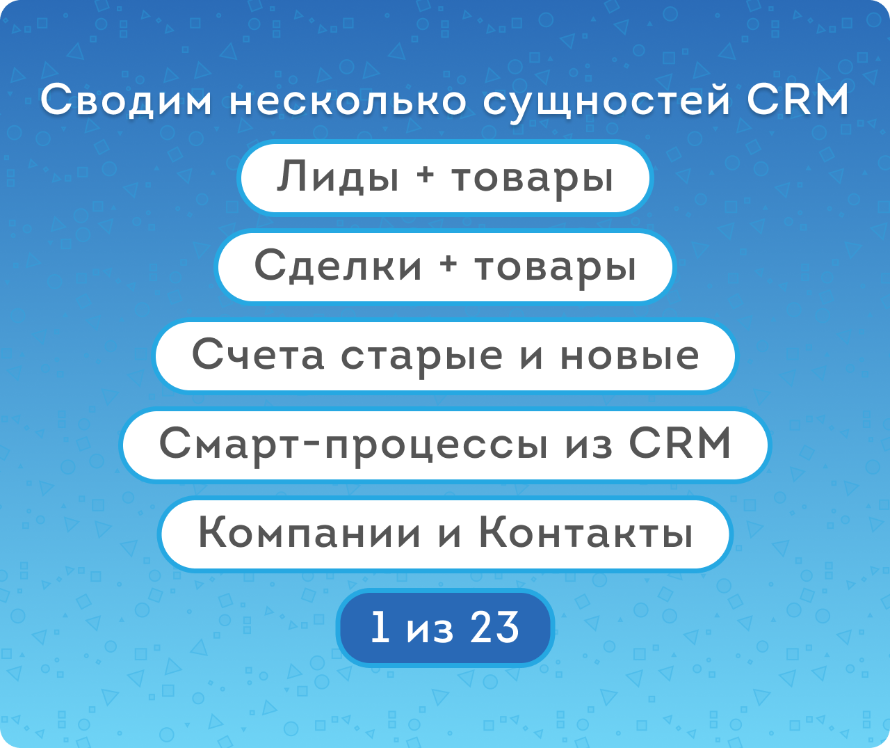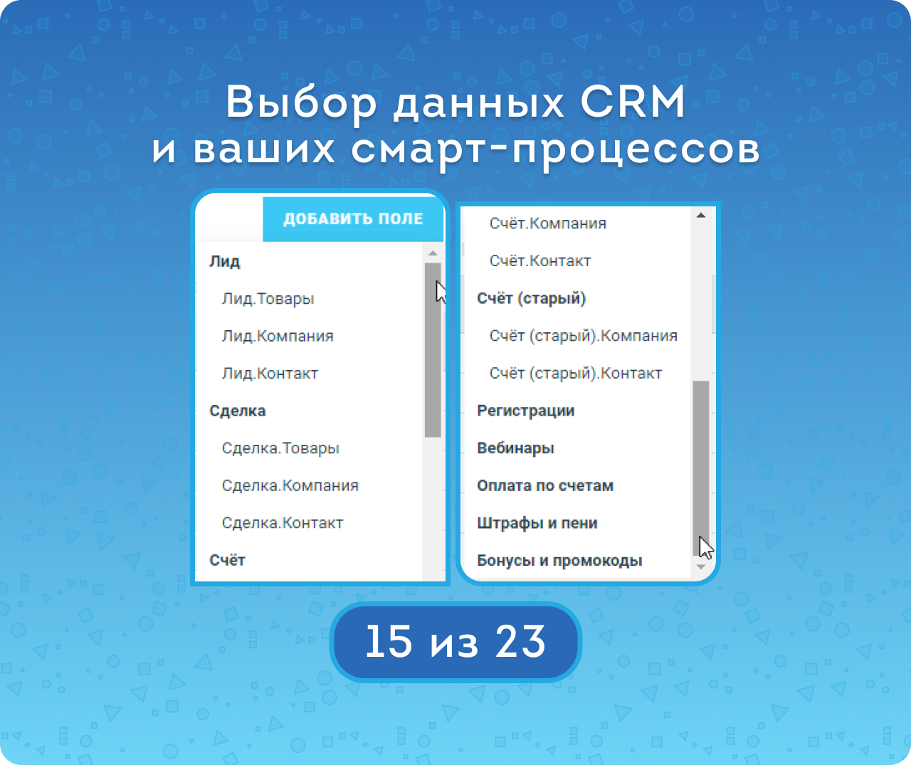 - Формировать отчетность по смарт-процессам, связанным с Лидами, Сделками и Счетами.